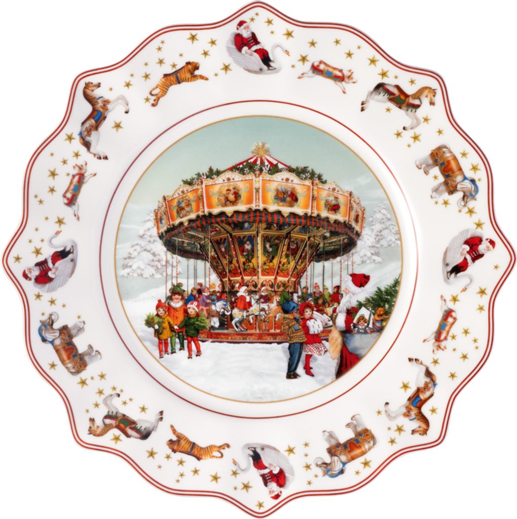 Porcelánový vianočný tanier s rozmerom 24 cm z nemeckého porcelánu Villeroy & Boch z kolekcie Annual Christmas Edition 2024. Zdobia ho vianočné motívy Santu s vrecom darčekov, ktorý pozoruje deti jazdiace na nostalgickom kolotoči uprostred vianočného trhu.