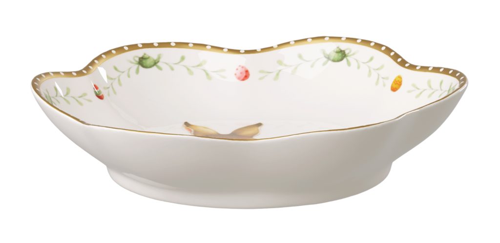 Porcelánová veľkonočná miska Villeroy & Boch z výročnej kolekcie Annual Easter Edition zaujme nežným motívom zajačika Paula s kuriatkami a jemným zlatým lemovaním. Vlnitý okraj, pastelové farby a detailná ilustrácia vytvárajú čarovnú jarnú atmosféru. Ideálna na servírovanie sladkostí, orieškov aj ako dekoratívny prvok.