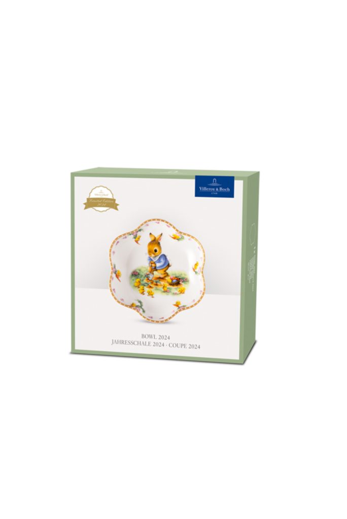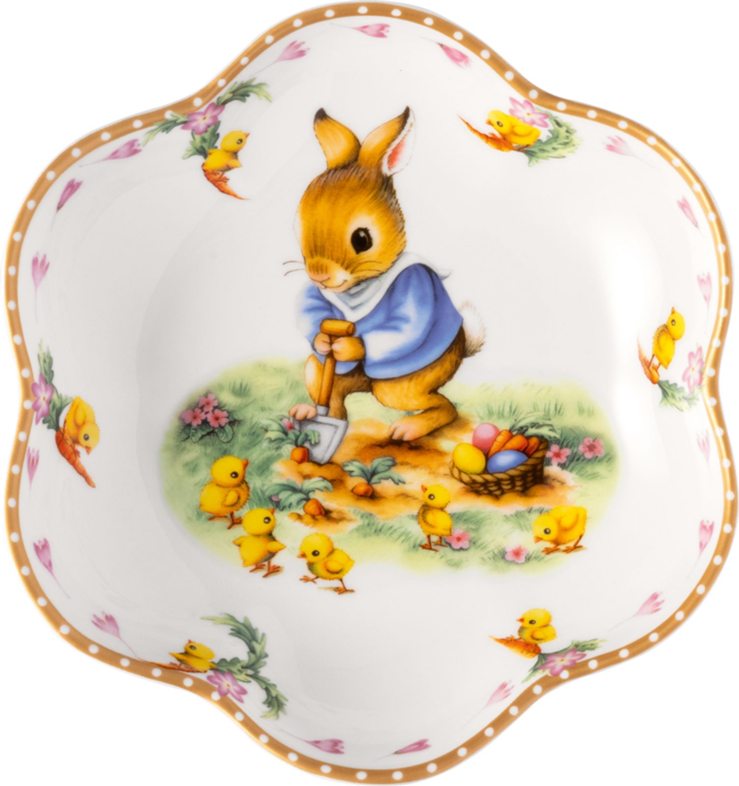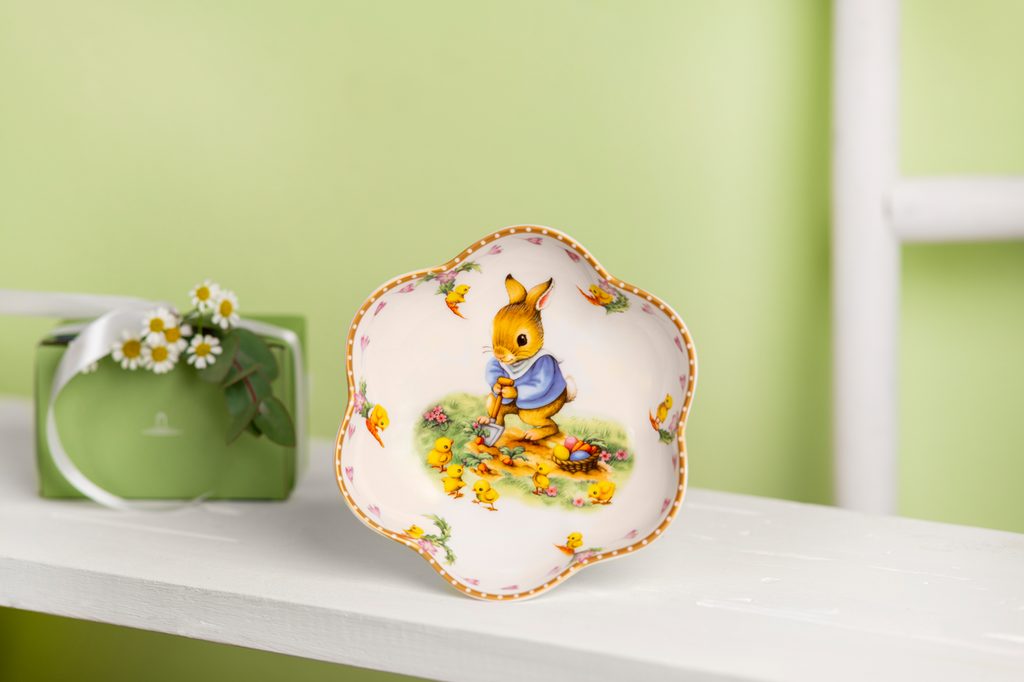 Porcelánová miska v tvare kvetu s láskyplným dizajnom zobrazuje zajačika Maxa, ako zbiera mrkvu, aby mamička zajačika Emma mohla upiecť chutný koláč. Porcelánová dekoratívna miska z limitovanej veľkonočnej kolekcie Annual Easter Edition 2024 nemeckej značky porcelánu Villeroy & Boch pohladí na duši. Bola vyrobená z prvotriedneho porcelánu s rozmerom 16,5 cm.