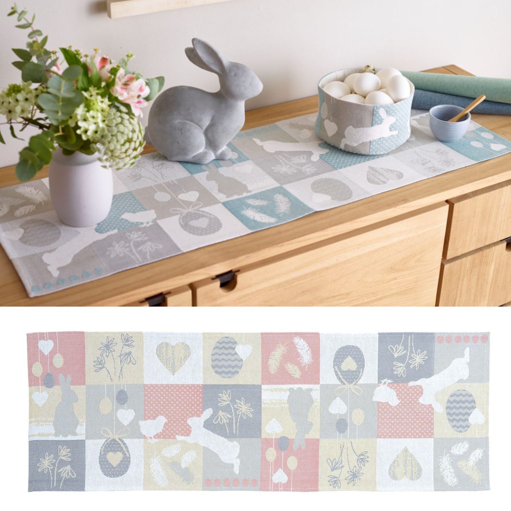 Gobelínový veľkonočný behúň Happy Easter s motivom zajačikmi a vajíčkami. Vytvorte si príjemnú veľkonočnú atmosféru s krásnym behúňom z pevného materiálu.