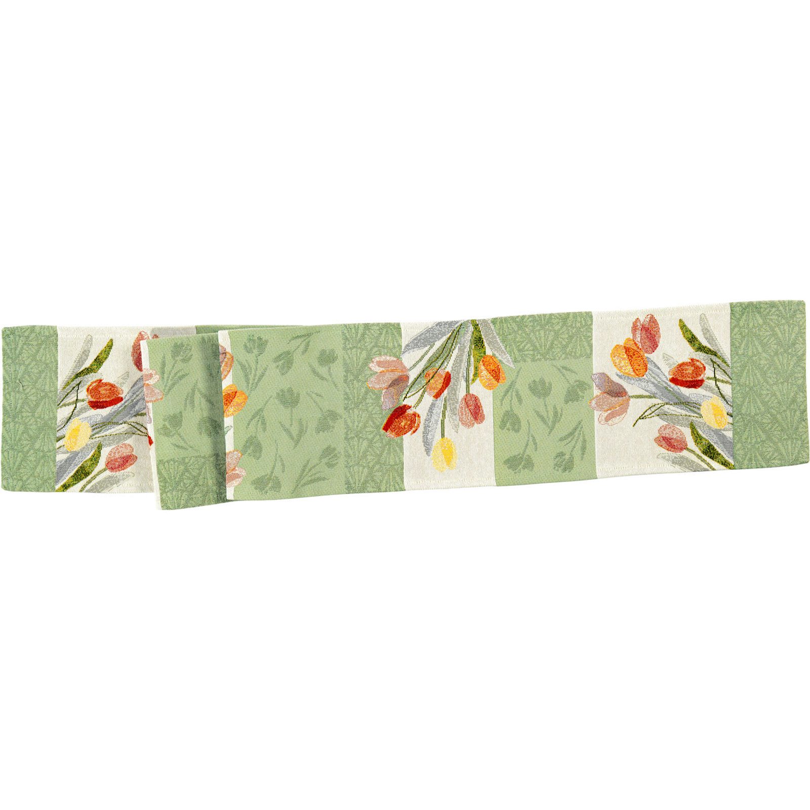 Gobelínový jarný běhúň Tulip Patch s motívom farebných tulipánov. Spríjemnite si veľkonočnú a jarnú atmosféru krásnym behúňom z pevného materiálu.
