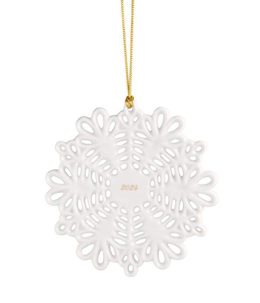 Vianočná porcelánová ozdoba snehová vločka zavesená na zlatej stuhe patrí do kolekcie Christmas Classic nemeckého porcelánu Villeroy & Boch. Limitovanú edíciu ozdoby snehovej vločky 2024 zdobia ručne vyrobené zlaté detaily a rok vydania.