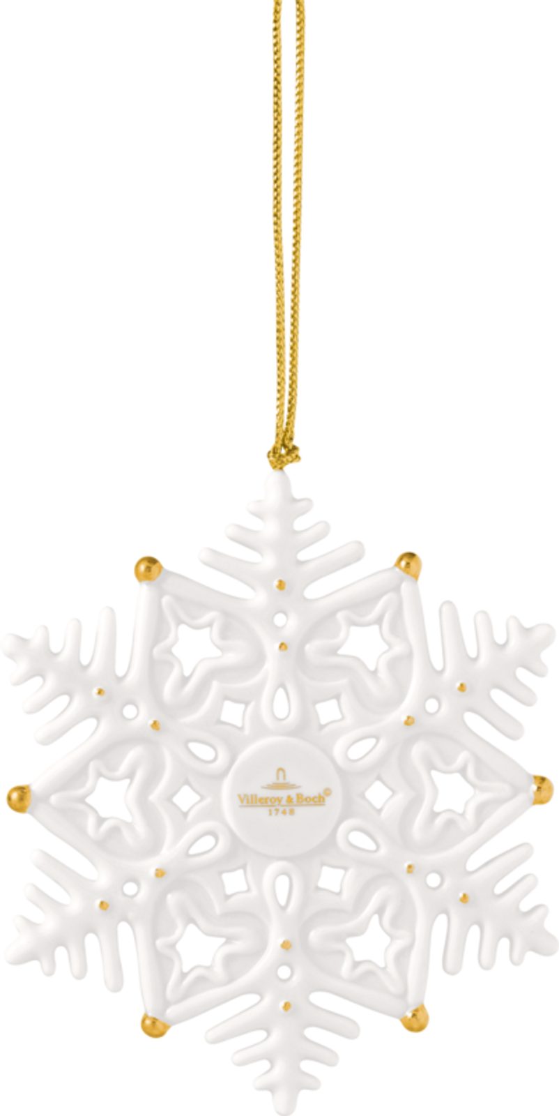 Vianočná porcelánová ozdoba snehová vločka zavesená na zlatej stuhe patrí do kolekcie Christmas Classic nemeckého porcelánu Villeroy & Boch. Limitovanú edíciu ozdoby snehovej vločky 2025 zdobia ručne vyrábané zlaté detaily a rok vydania.