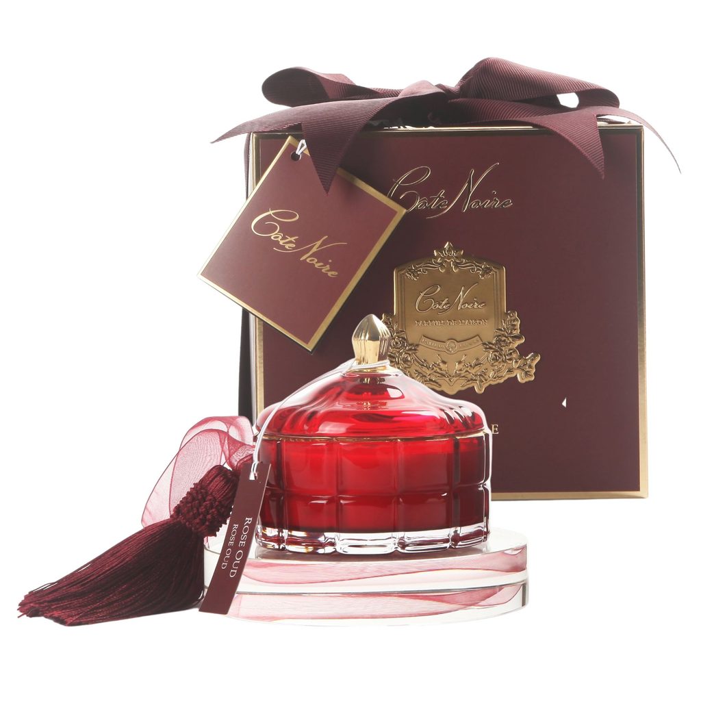 Intenzívna vôňa damašskej ruže, santalového dreva, pižma a agarového dreva vytvára ikonický parfém Rose Oud. Luxusná sviečka Art Deco Côte Noire Red & Gold z prírodného vosku Ecoluxe horí až 50 hodín a v krásnej červenej nádobke s elegantným strapcom predstavuje dokonalý exkluzívny darček a štýlový interiérový doplnok.