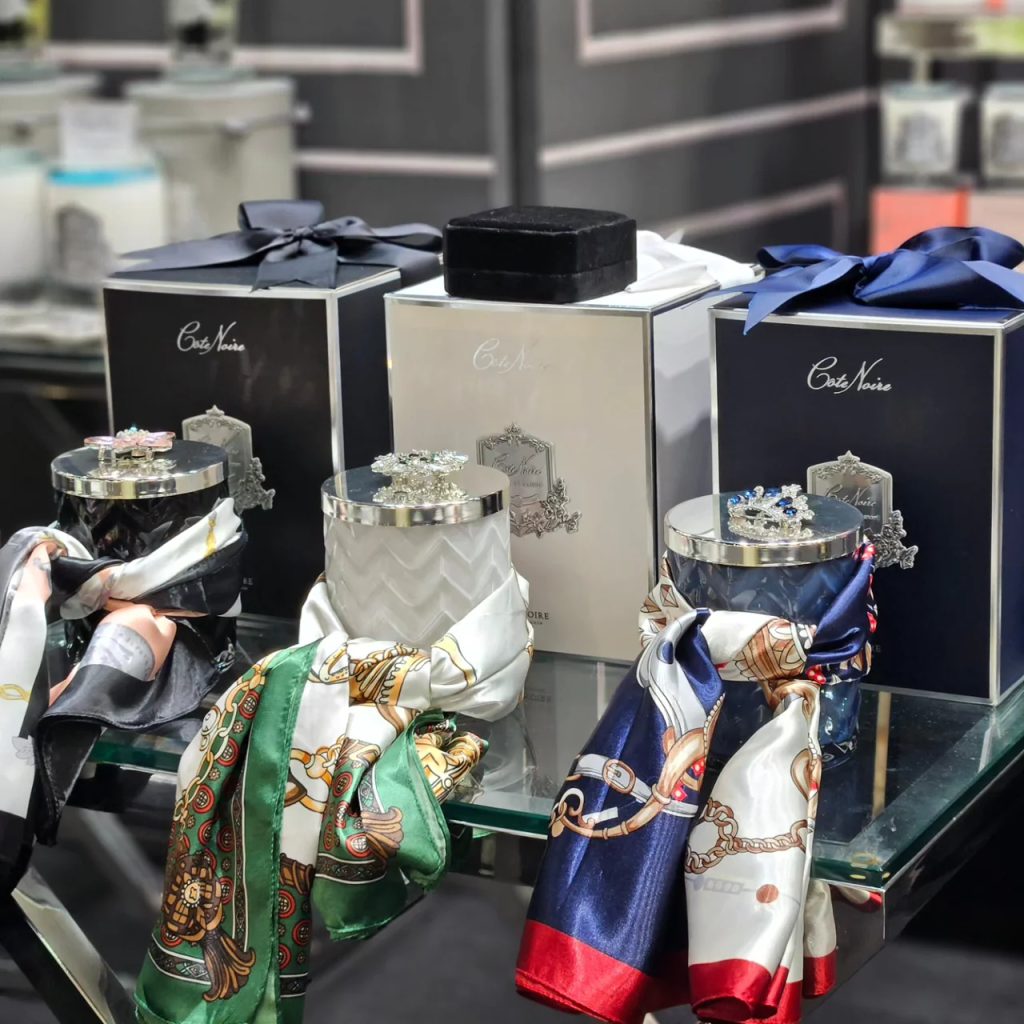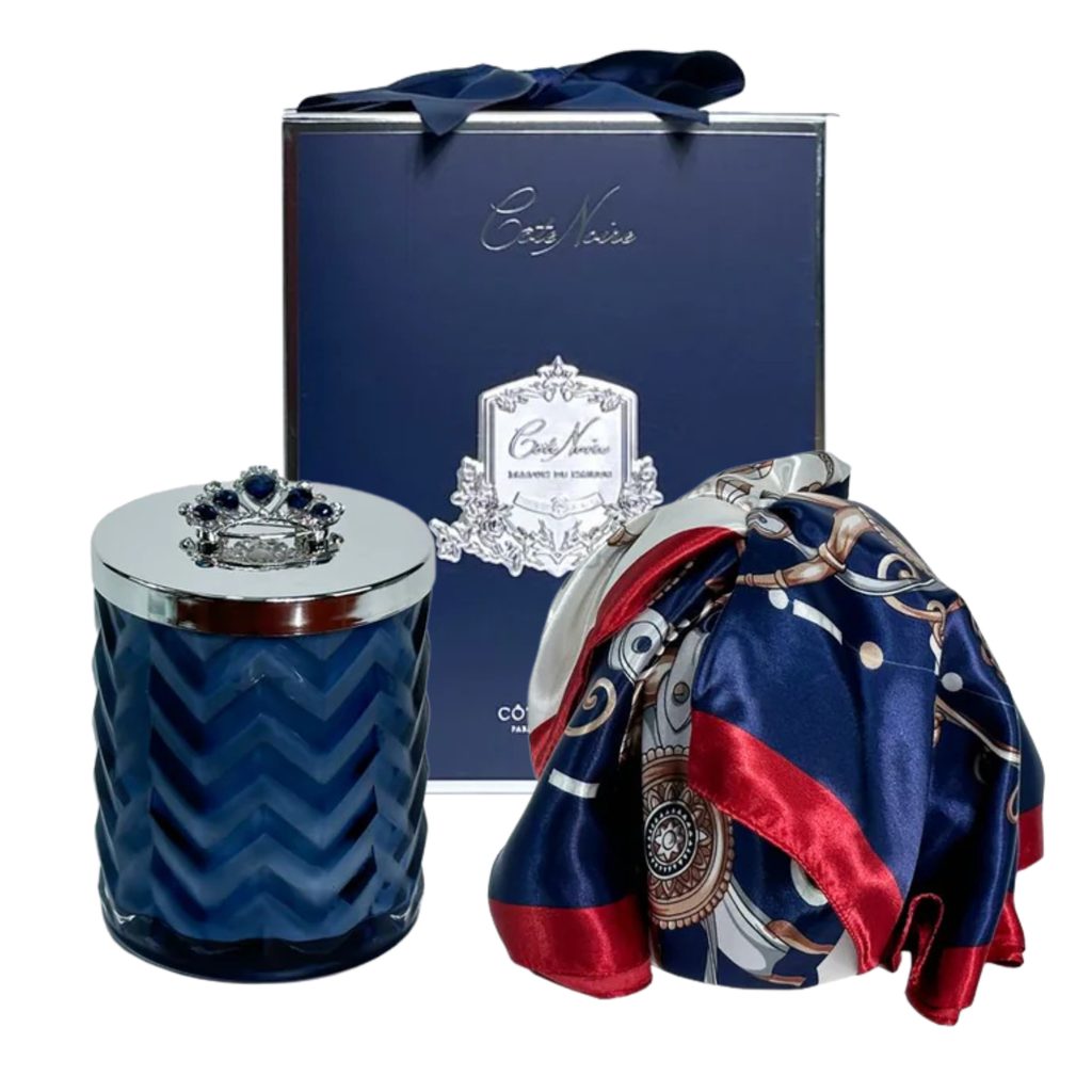 Limitovaná edícia sviečky Herringbone Côte Noire Black & Silver so šatkou horí až 100 hodín v dekoratívnej modrej nádobe so striebornými prvkami a magnetickou brošňou, čo z nej robí dokonalý exkluzívny darček a štýlový interiérový doplnok. S vôňou fíg, černíc, ktorá sa prelína s vôňou ruží a pivoniek.