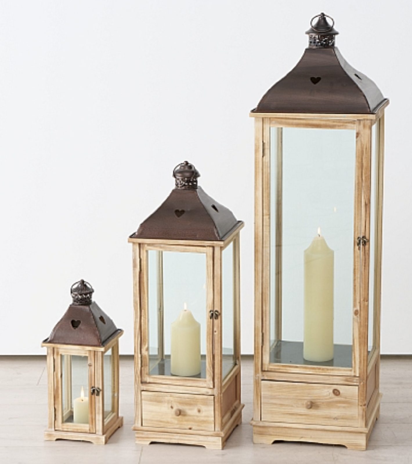 Vysoká krásna drevená lampáš na vysokú sviečku, s hnedou plechovou strechou so srdiečkami na každej strane as pomocným zásuvkou na zápalky, ktoré môžete mať uložené priamo pod lampášom < / p>