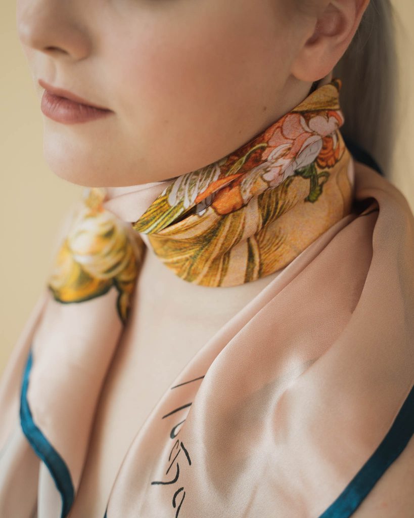 Zahaľte sa do luxusu a príjemného hodvábu. Táto exkluzívna šál dodá vášmu každodennému, ale aj spoločenskému outfitu eleganciu. V zime Vás príjemne zahreje av lete ochladí. Dámska hodvábna šál The Seasons: Spring od českého maliara Alfonsa Muchu.