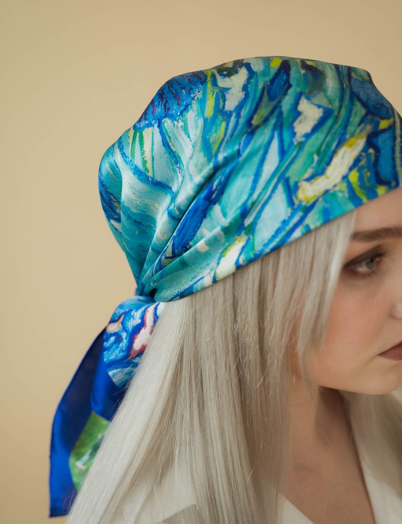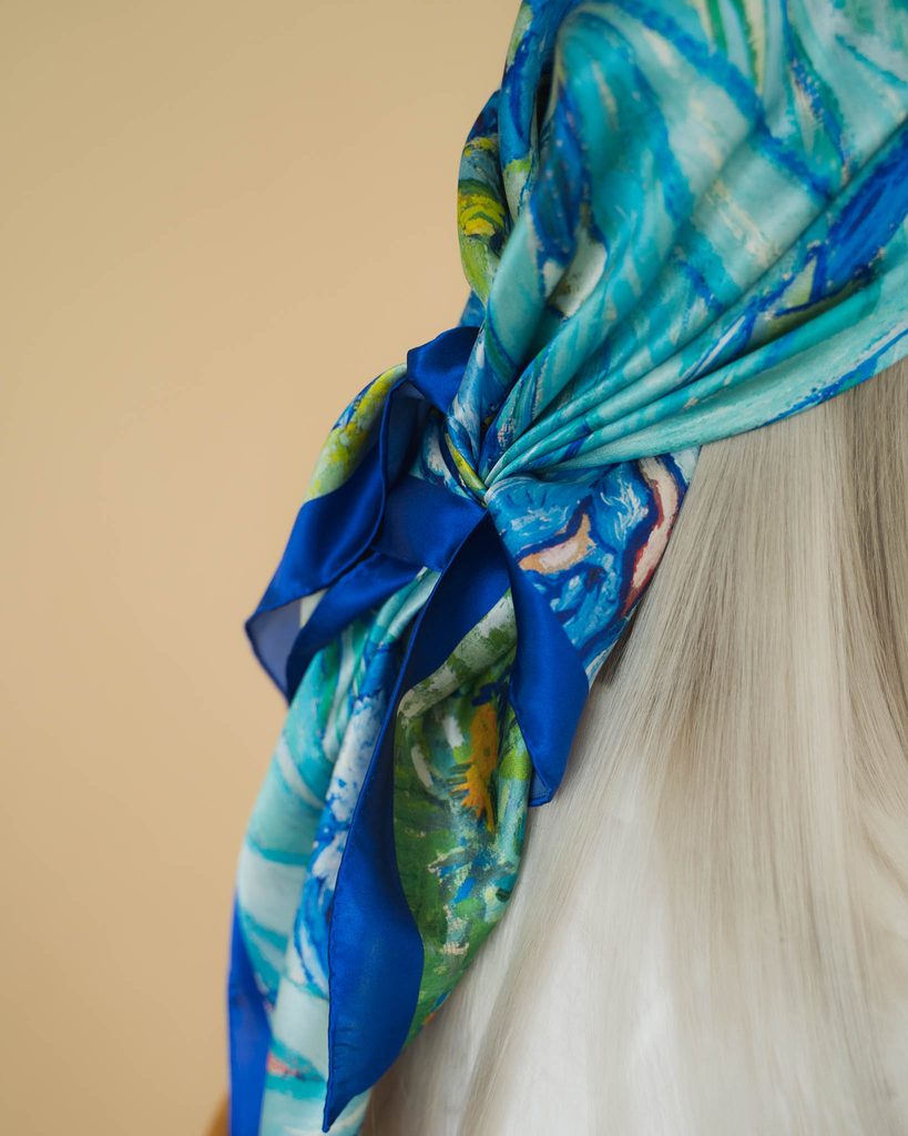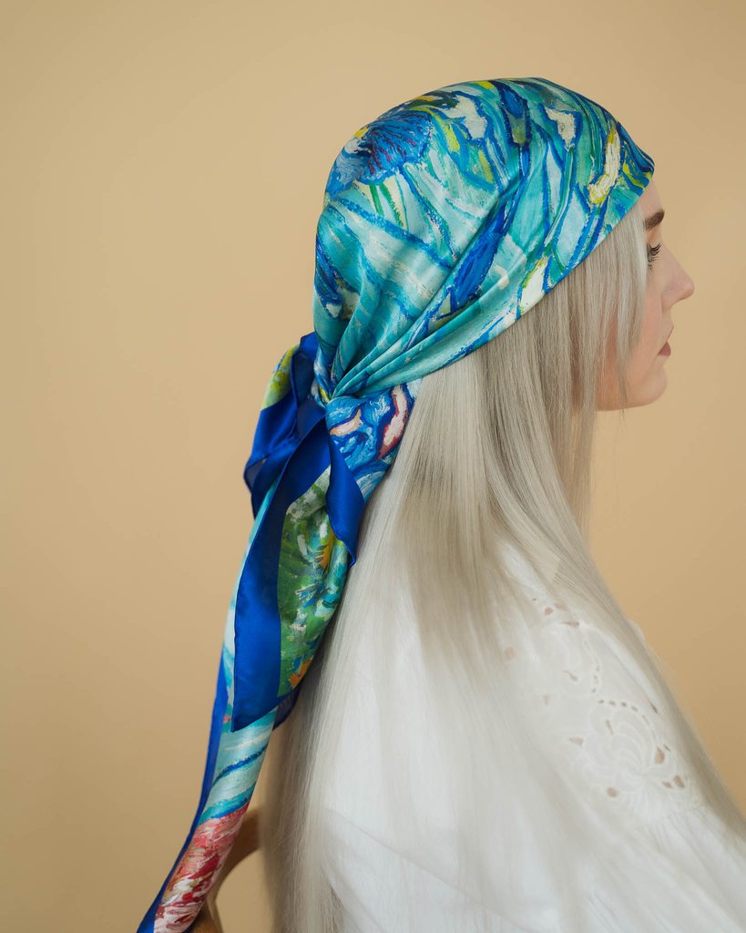 Zahaľte sa do luxusu a príjemného hodvábu. Tento exkluzívny šatka dodá vášmu každodennému, ale aj spoločenskému outfitu eleganciu. V zime Vás príjemne zahreje av lete ochladí. Dámsky hodvábna šatka Irises od holandského maliara a kresliara Vincent Van Gogh