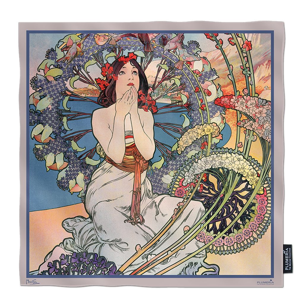 Luxusná hodvábna šatka Plumeria s motívom Monaco Monte Carlo od Alfonsa Muchu. Elegantný doplnok zo 100 % prírodného hodvábu, ktorý poteší milovníkov umenia a kvalitnej módy. Zahaľte sa do štýlu, ktorý vás v zime zahreje a v lete ochladí.