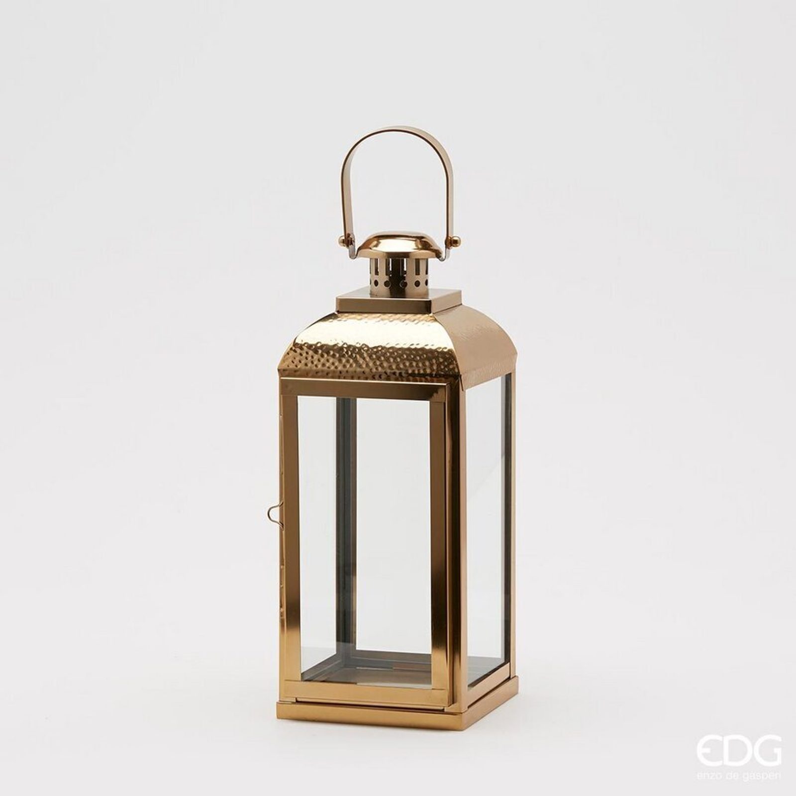 Tento štýlový zlatý lampáš je dokonalým doplnkom do vášho interiéru alebo exteriéru. Je vyrobená z kvalitného kovu s jemným kladivkovým vzorom, ktorý jej dodáva elegantný a sofistikovaný vzhľad. Sklenené steny umožňujú krásny výhľad na sviečku vo vnútri a vytvárajú teplú a príjemnú atmosféru.