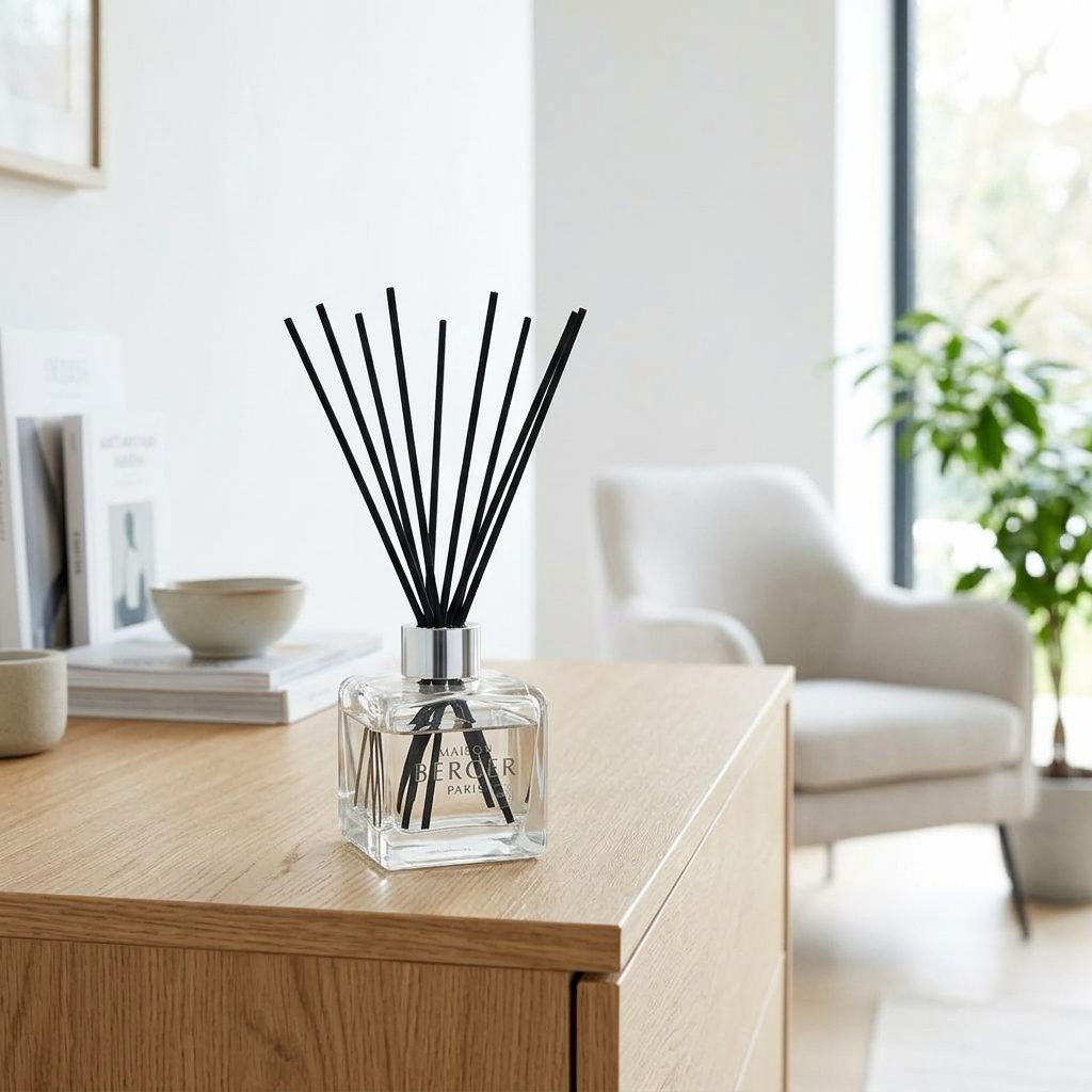Elegantný aróma difuzér Maison Berger Paris s vôňou Nebeská voda prevonia váš domov sviežou vôňou čistoty, pokoja a prirodzenej harmónie. Moderný sklenený dizajn s kubickým tvarom a strieborným uzáverom je štýlovým doplnkom interiéru.