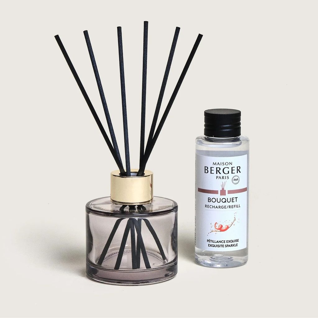 Elegantná darčeková sada Maison Berger Paris - Rosalie obsahuje arómu difuzér a bytový sprej s vôňou Intenzívny ligot – prevonia váš domov šumivou kombináciou grapefruitu, ruže a pačuli. Elegantný dizajn v šedom skle a neodolateľná vôňa robí z tejto sady dokonalý darček pre milovníkov francúzskeho luxusu.