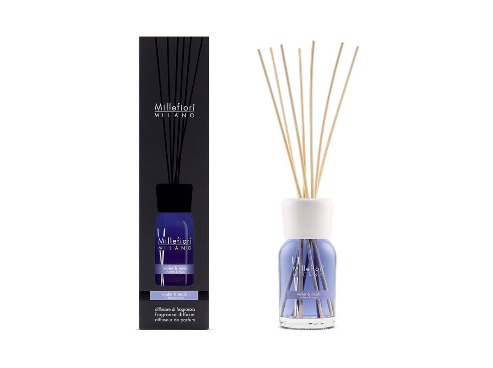1 ks Millefiori Milano - Natural aróma difuzér Violet amp; Musk, 100ml 7 ks Millefiori Milano - Natural tyčinky do difuzéra 100 ml, prírodné 25 cm 1 ks Papierová krabička s priehľadom