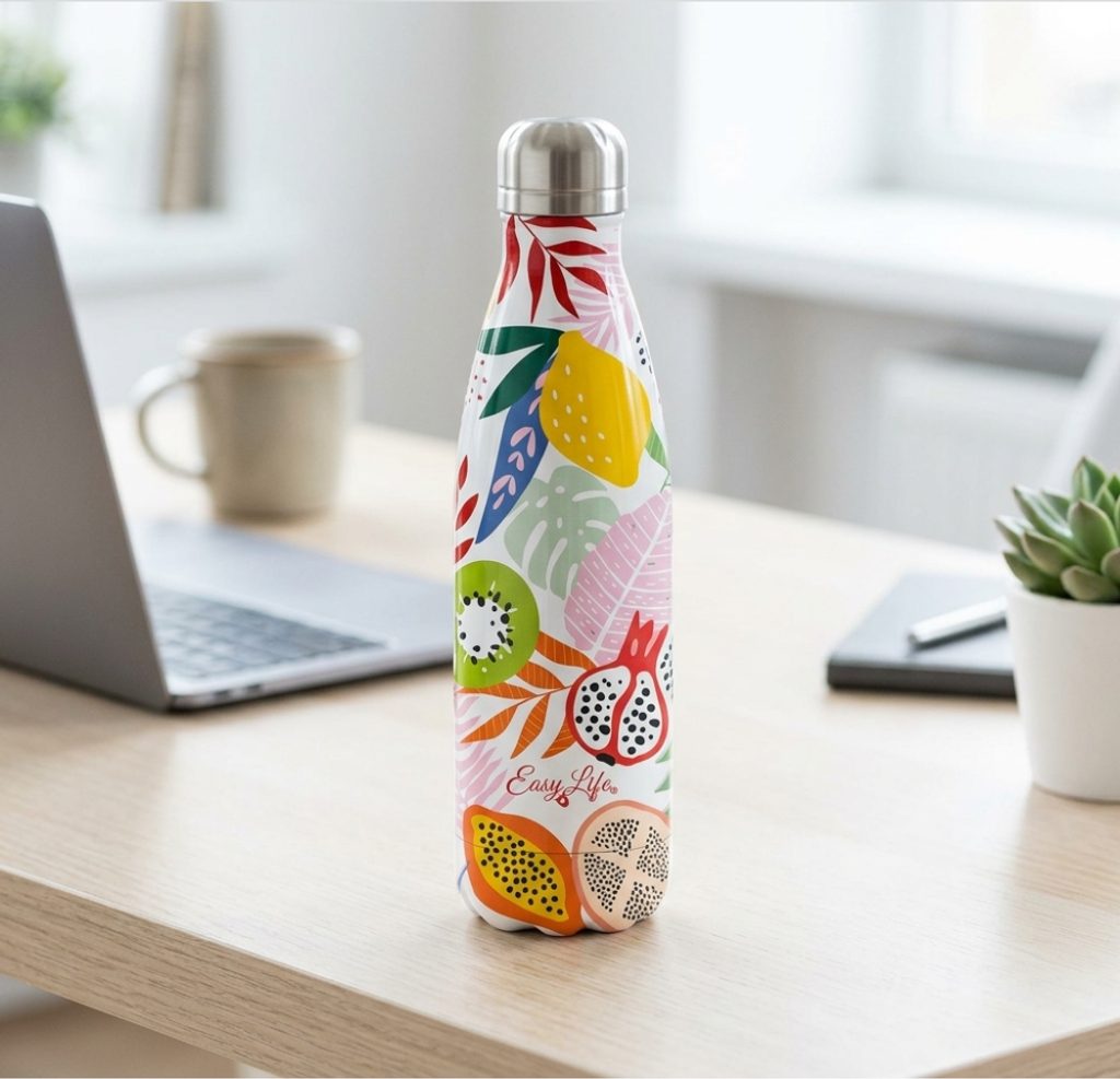 Štýlová nerezová termoska Tutti Frutti s objemom 500 ml od značky Easy Life s hravým ovocným dizajnom. Vďaka dvojitej stene udrží nápoje teplé až 12 hodín a studené až 24 hodín. Ideálna na cesty, do práce aj na šport.
