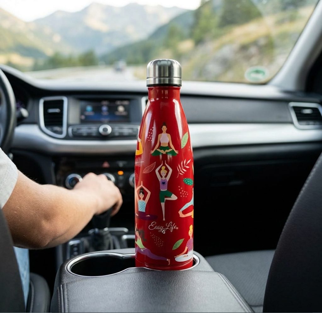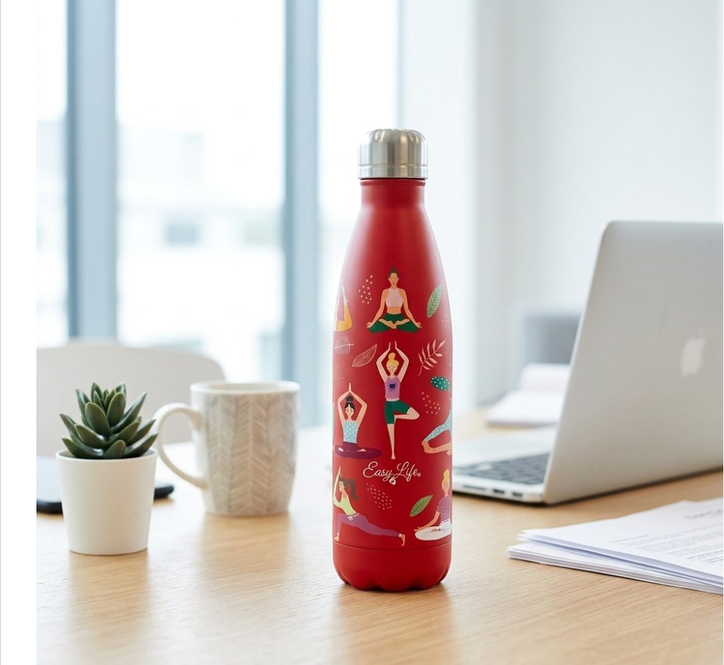 Štýlová nerezová termoska Yoga 500 ml od značky Easy Life s originálnym motívom jogy. Vďaka dvojitej stene udrží nápoje teplé až 12 hodín a studené až 24 hodín. Ideálna na cesty, do práce aj na šport.