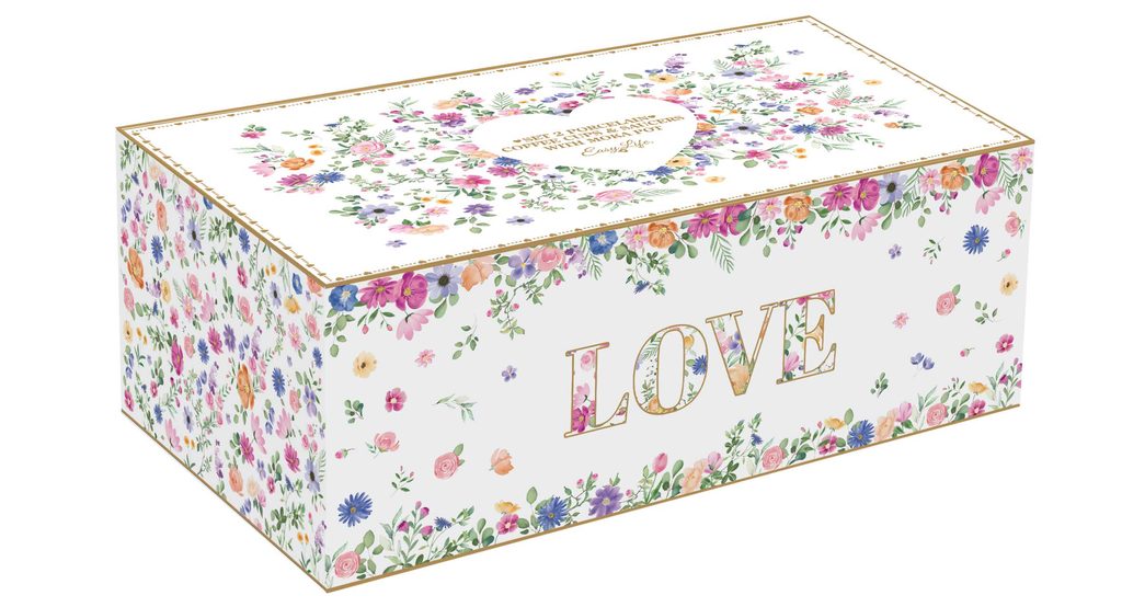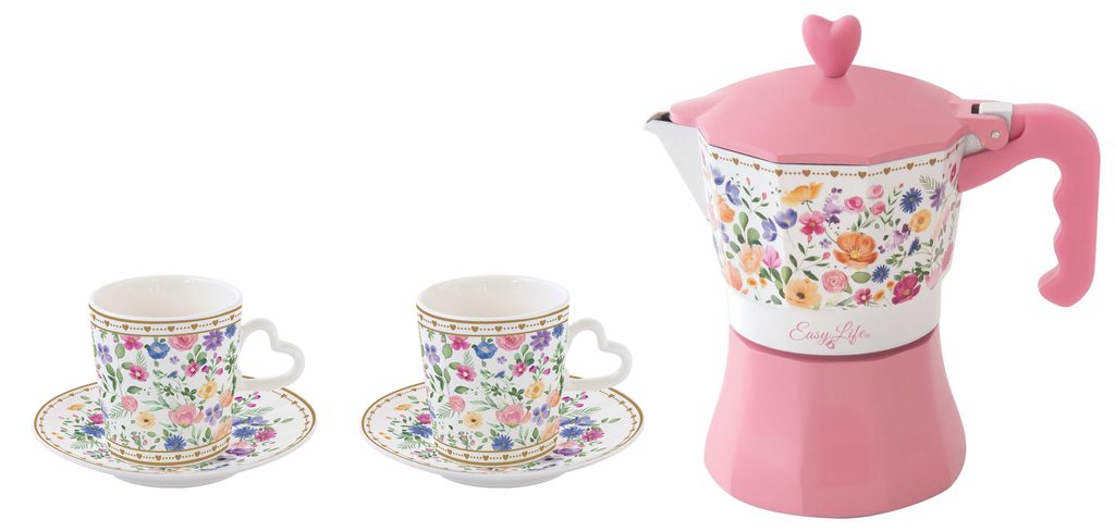 Štýlová súprava dvoch porcelánových šálok na espresso s kanvičkou na moka z kolekcie Mon Amour talianskej značky Easy Life. Romantický kvetinový dizajn so zlatými detailmi a elegantná kanvička vo vintage štýle prinášajú dokonalý zážitok z kávy. Balené v darčekovej škatuľke.
