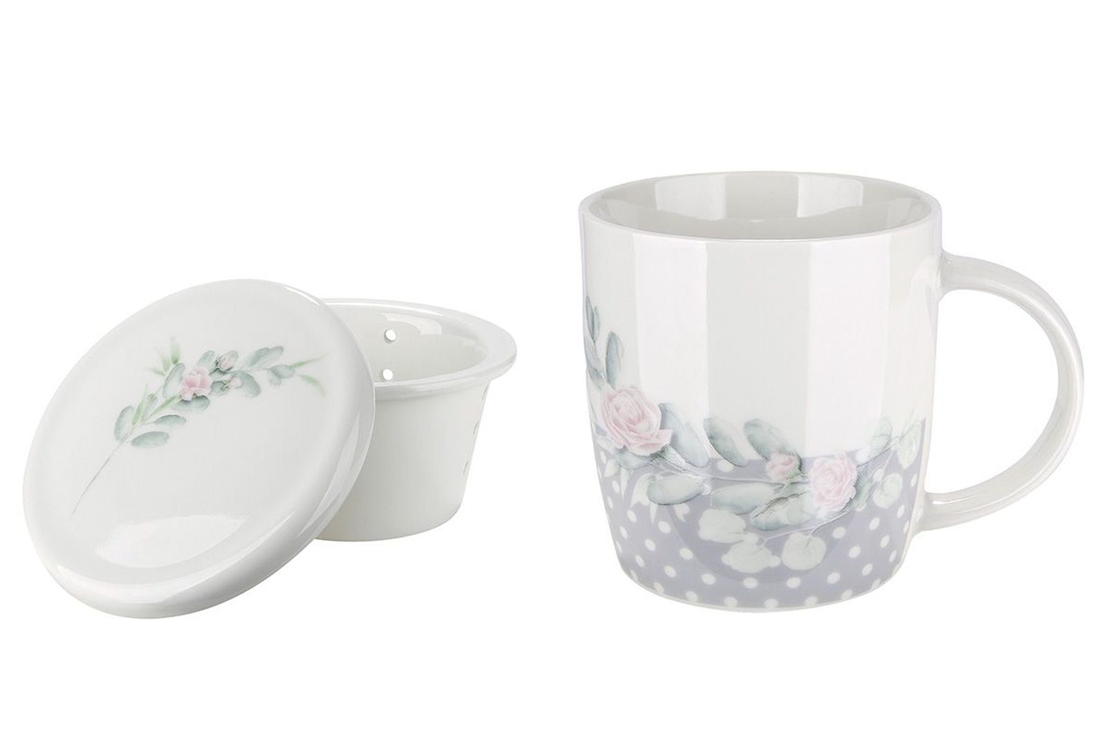 Porcelánový set na čaj obsahuje hrnček, porcelánové sitko na sypaný čaj s otvorom a pokrievka. Set sa vzorom bielych bodiek na svetlozltá modrom podklade oživený Ružovou ruží so zelenými lístkami. Krásny jarný farby a nežnosti kolekcie Botanic Chic. Porcelánový hrnček so sitkom a pokrievka je zabalený v darčekovom balení s rovnakým motívom Ako na porcelán.