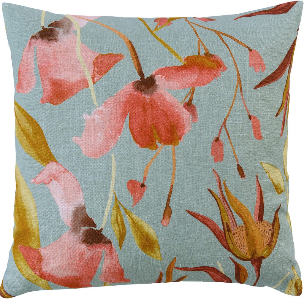 Elegantný ľanový poťah na vankúš Eliza s kvetinovým motívom v teplých ružových a zlatistých tónoch na modrom podklade oživí každý interiér. Perfektný pre každú príležitosť s digitálnou potlačou na ľanovej zmesovej látke.