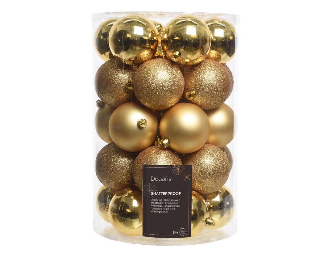 Sada vianočných plastových ozdôb 34ks zlatých, 8 cm