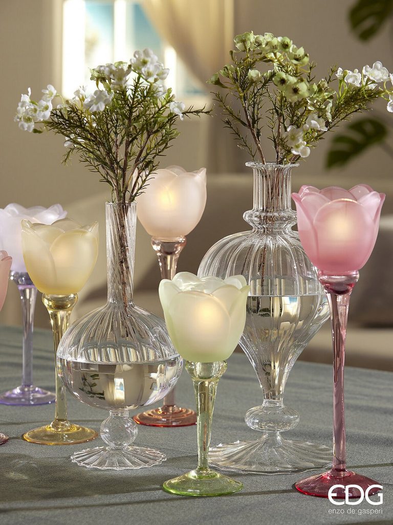 Skleněný svícen ve tvaru tulipánu žlutý/oranžový/zelený 1ks, 28x8,5 cm Sklenený svietnik na čajovú sviečku Bombato číry, 7x9,5 cm