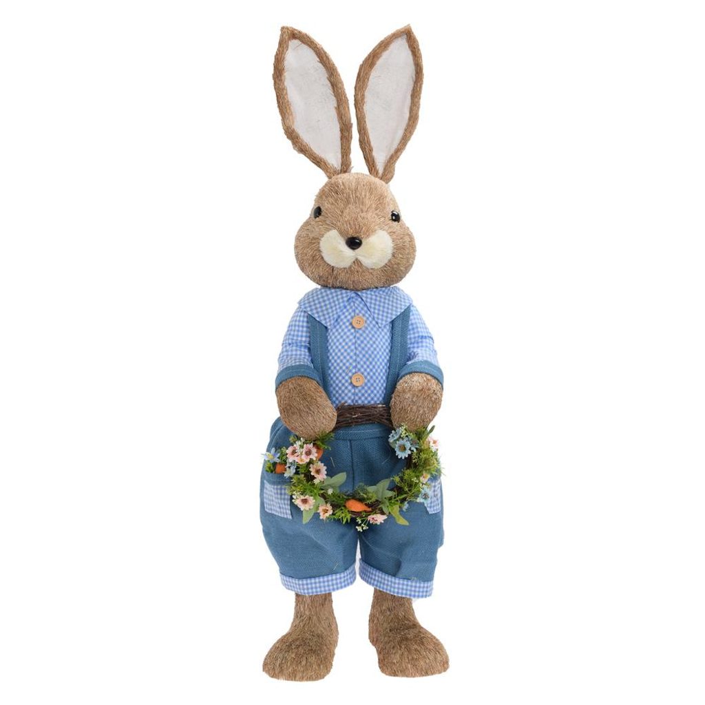 Velikonoční dekorace slaměný zajíc s věnečkem modrý, 40x34x120 cm