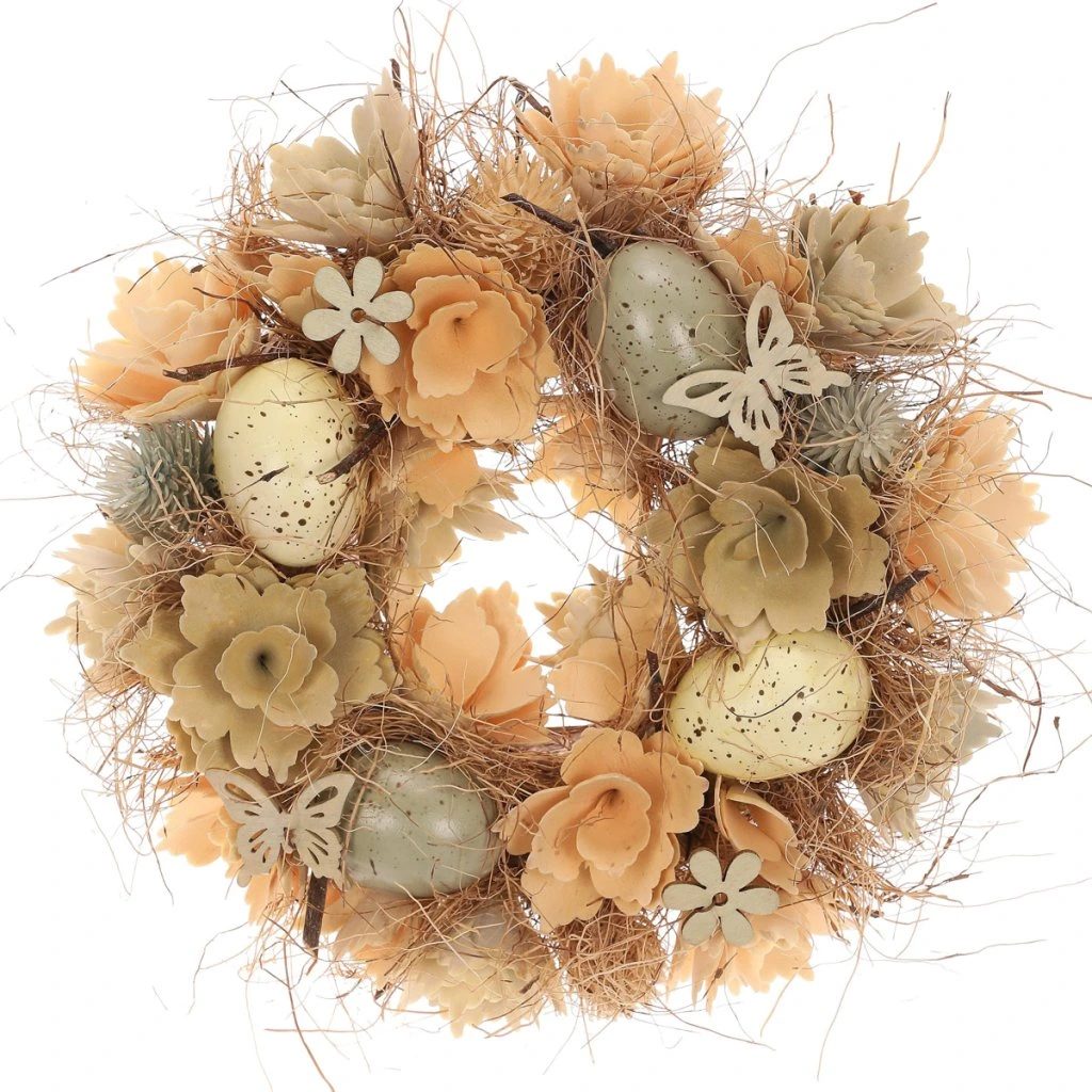 Velikonoční dekorace věnec s květy a vajíčky přírodní, 25 cm