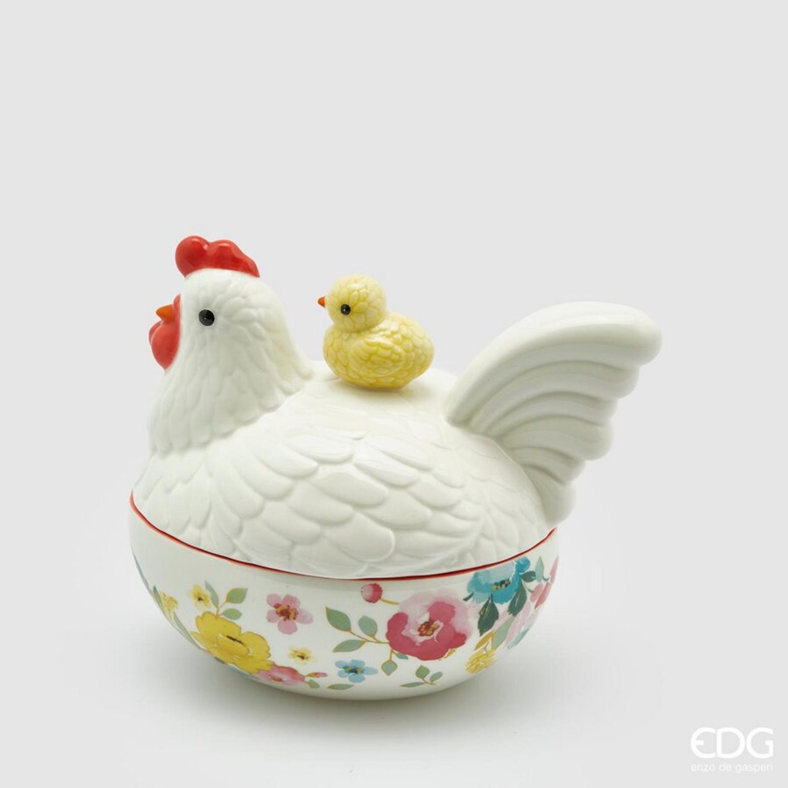 Krabička v tvare sliepočky s kuriatkom je na dne zdobená jarnými kvetmi. Sliepočka je ideálna ako dekoratívny prvok na váš stôl alebo poličku. Táto škatuľka je ideálna na uloženie drobností alebo slúži ako originálna dekorácia do vašej domácnosti. Umiestnite ju na stôl, poličku alebo komodu a nechajte svoje prostredie naplniť veselosťou a teplom jari.