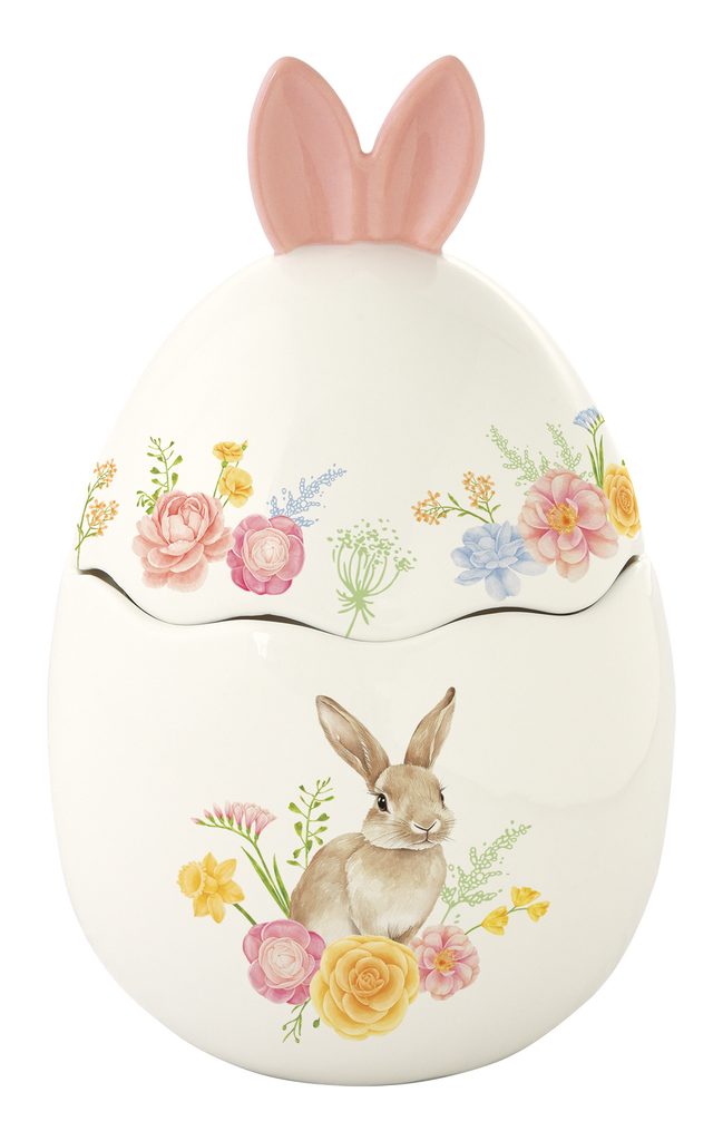Porcelánová nádoba v tvare veľkonočného vajíčka s jemným motívom zajačika a kvetov vnesie do vášho interiéru jarné čaro a eleganciu. Krásna dekorácia a praktická dóza na sladkosti alebo drobnosti, ideálna aj ako darček.