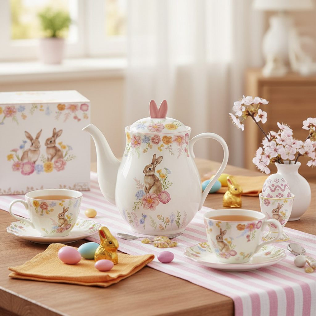 Veľkonočná porcelánová kanvica na čaj značky Easy Life s romantickým motívom zajačika a jemných kvetov v pastelových farbách. Hravé viečko s uškami dodáva kanvici jedinečný jarný vzhľad. Ideálna na servírovanie čaju počas Veľkej noci, dodávaná v darčekovej krabičke – perfektná ako štýlový darček.