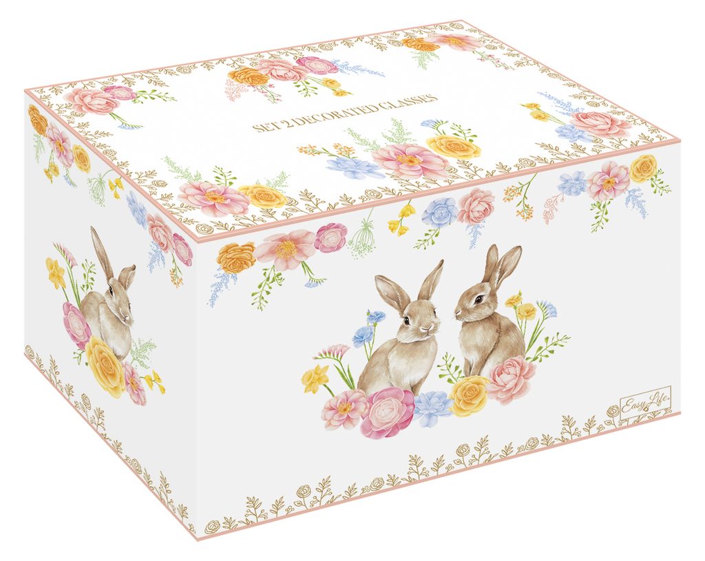 Jemne zdobené poháre s veľkonočným motívom zajačika a kvetov v pastelových farbách dodajú stolovaniu jarnú sviežosť a sviatočnú atmosféru. Elegantné sklenené prevedenie s objemom 0,5 l je ideálne na vodu, limonády aj osviežujúce nápoje. Vďaka darčekovej krabičke sú vhodné aj ako krásny veľkonočný darček.