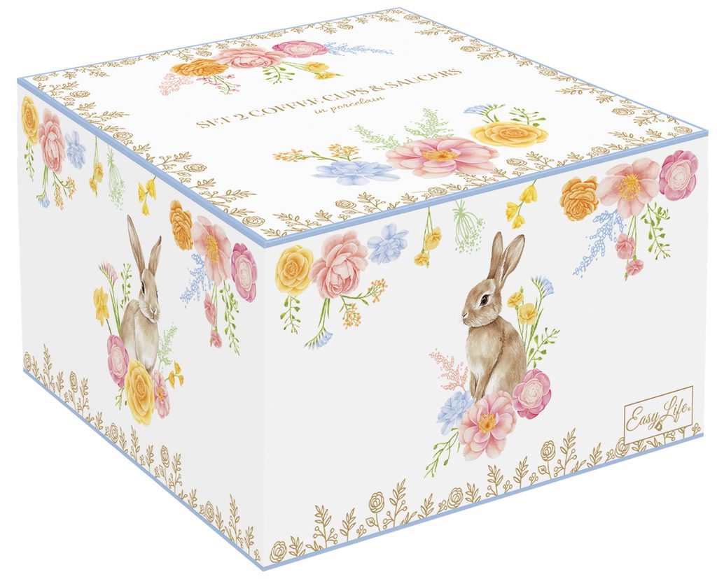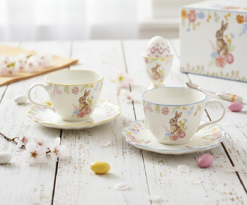 Elegantné porcelánové šálky s podšálkami a jemným veľkonočným motívom zajačikov a kvetov vytvoria z každého posedenia pri káve alebo čaji jarný sviatok. Štýlová sada aj krásny veľkonočný darček.
