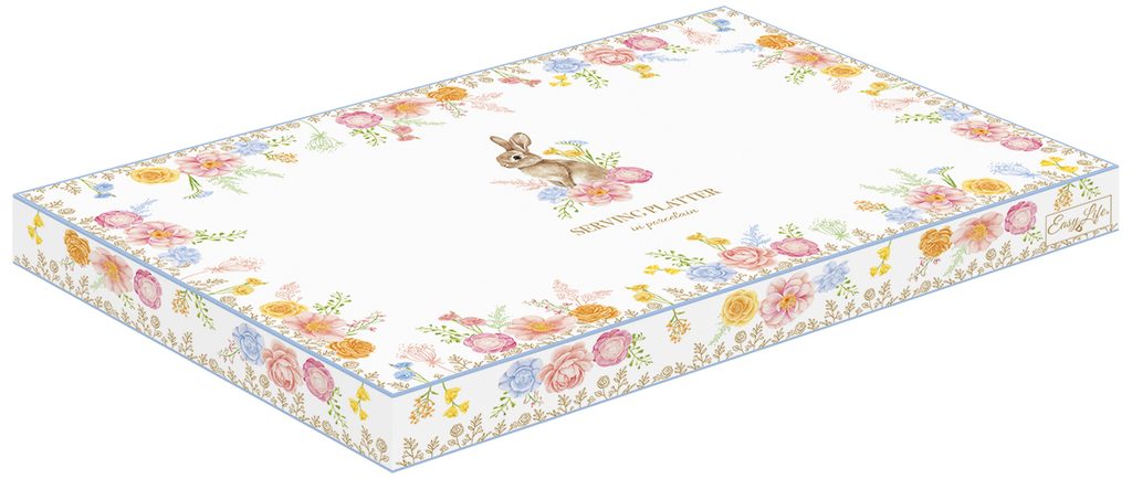 Jemný porcelánový podnos s vlnitým okrajom a veľkonočným motívom zajačika a kvetov prinesie na váš stôl jarnú eleganciu a sviatočnú atmosféru. Ideálny na servírovanie aj ako krásny veľkonočný darček.