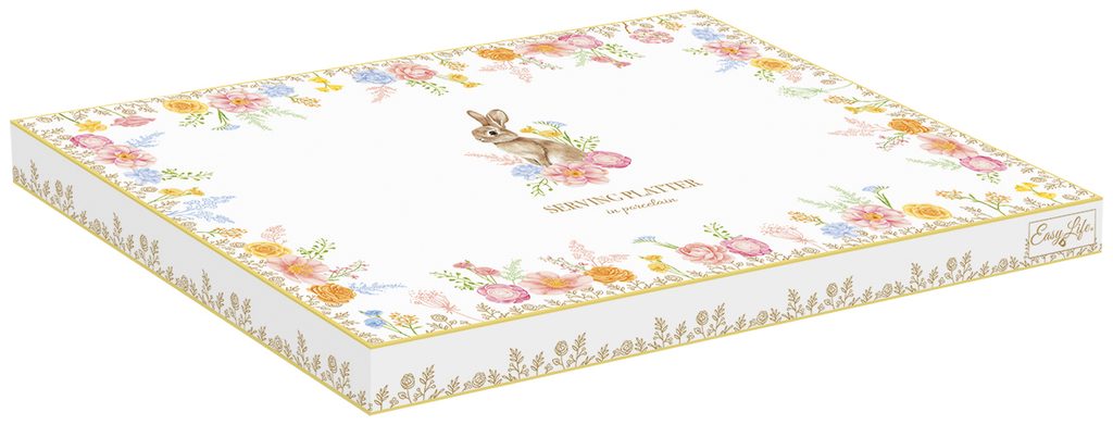 Jemný porcelánový podnos v tvare veľkonočného vajíčka prinesie na váš stôl jarnú sviežosť, eleganciu a sviatočnú atmosféru. Kvetinový motív so zajačikom a zlatými detailmi je ideálny na servírovanie dezertov aj ako štýlová veľkonočná dekorácia.
