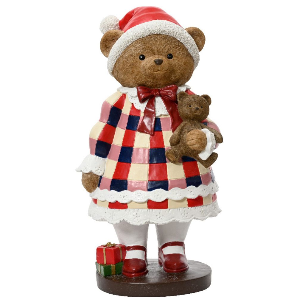 Rozkošná vianočná figúrka medvedíka v šatách od spoločnosti Kaemingk vyčarí úsmev na tvári malým aj veľkým. Detailne prepracovaná dekorácia z polyresinu s výškou 57,5 cm je ideálna do predsiene, pod stromček alebo do detskej izby.