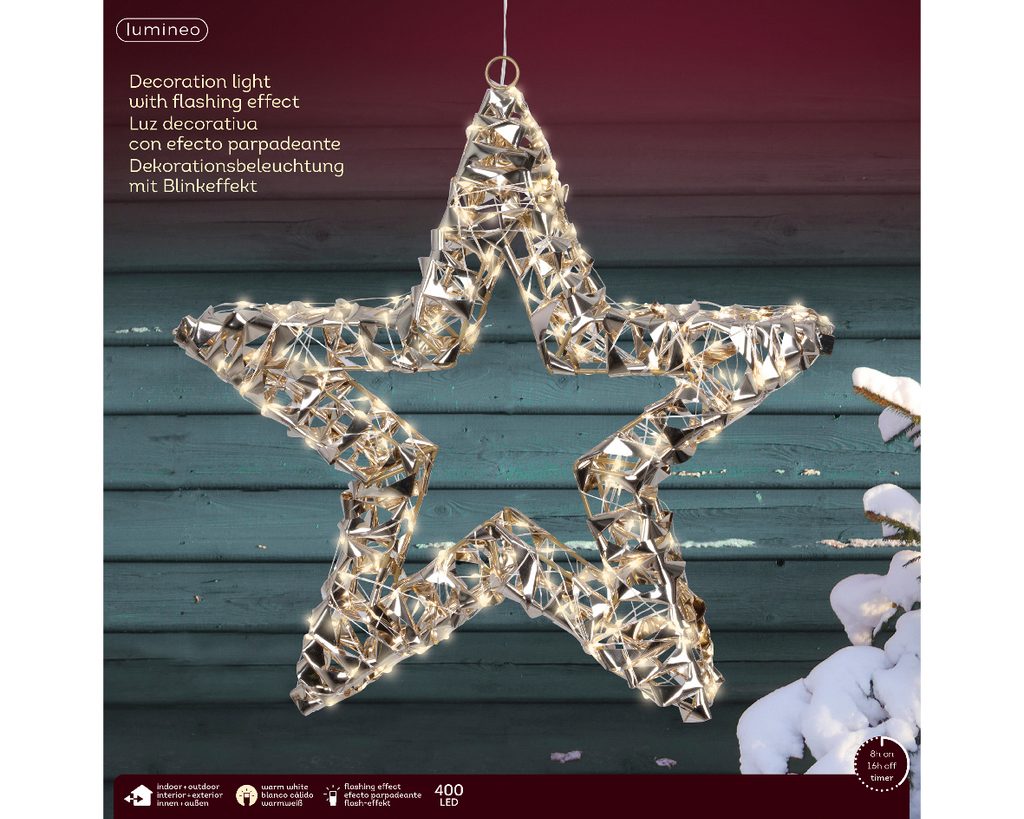 Žiarivá poinsettia v elegantnej zlatej farbe so 400 teplými bielymi LED svetlami a blikajúcim efektom. Magická dekorácia do interiéru aj exteriéru, ktorá rozžiari každý kút vášho domova.