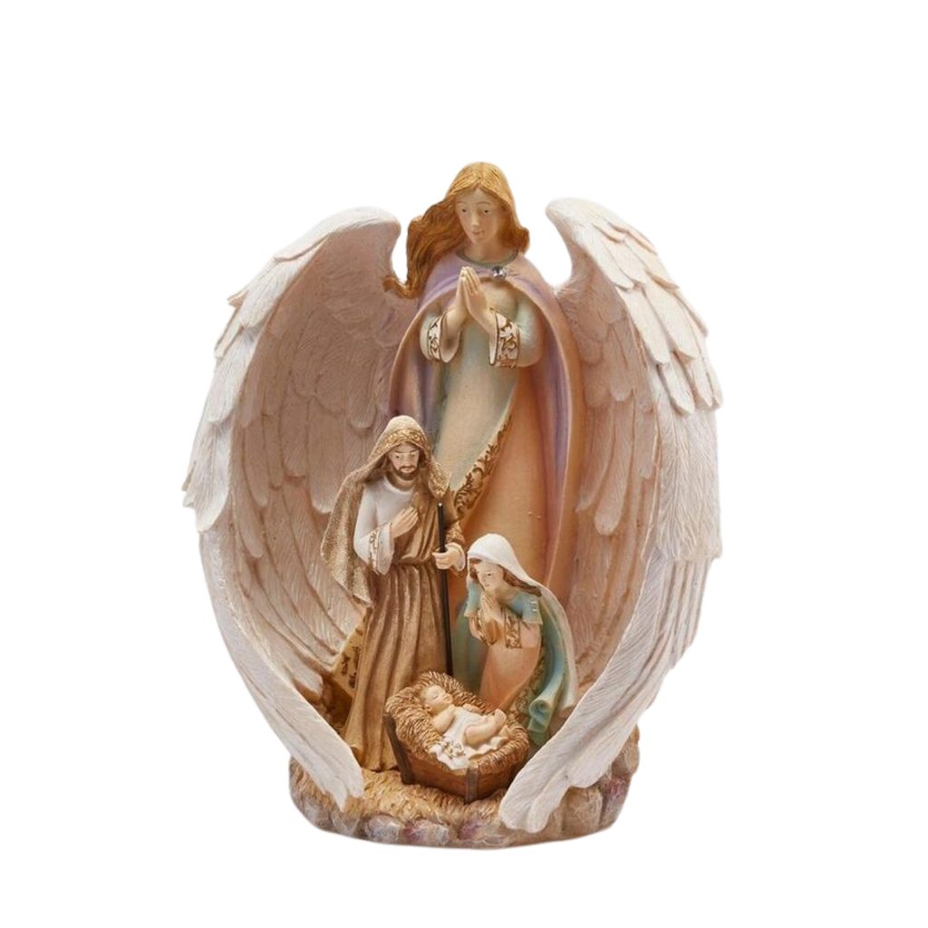 Nádherná socha Svätej rodiny pod ochrannými krídlami anjela od EDG - Enzo De Gasperi je nežná a inšpiratívna vianočná dekorácia plná lásky a pokoja. Anjel s roztiahnutými krídlami chráni a obklopuje Jozefa, Máriu a novorodenca Ježiša, čím vyjadruje posolstvo bezpečia a viery.