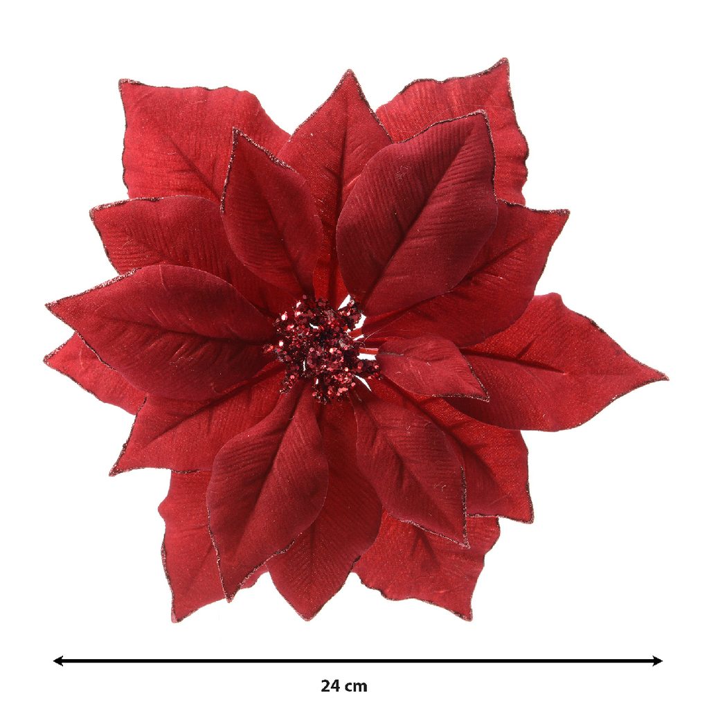 Ozdobte svoj vianočný stromček alebo sviatočnú výzdobu krásnou červenou poinsettia od spoločnosti Kaemingk. Bohaté zamatové okvetné lístky sú zdobené trblietavými flitrami, ktoré odrážajú svetlo a dodávajú dekorácii luxusný vzhľad.