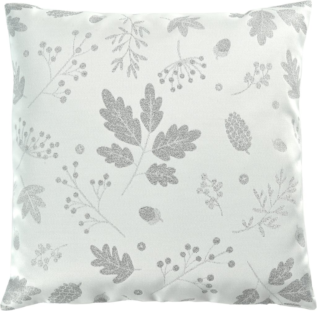 Vianočný poťah na vankúš Piante s jemným strieborným leskom prináša kúzlo prírodných motívov priamo na váš nábytok. Listy, žalude a kvety vytvárajú harmonický vzor, ktorý ozdobí každú pohovku. Vylepšite vzhľad svojho domova vankúšom s lesklým efektom a užite si vianočnú atmosféru.