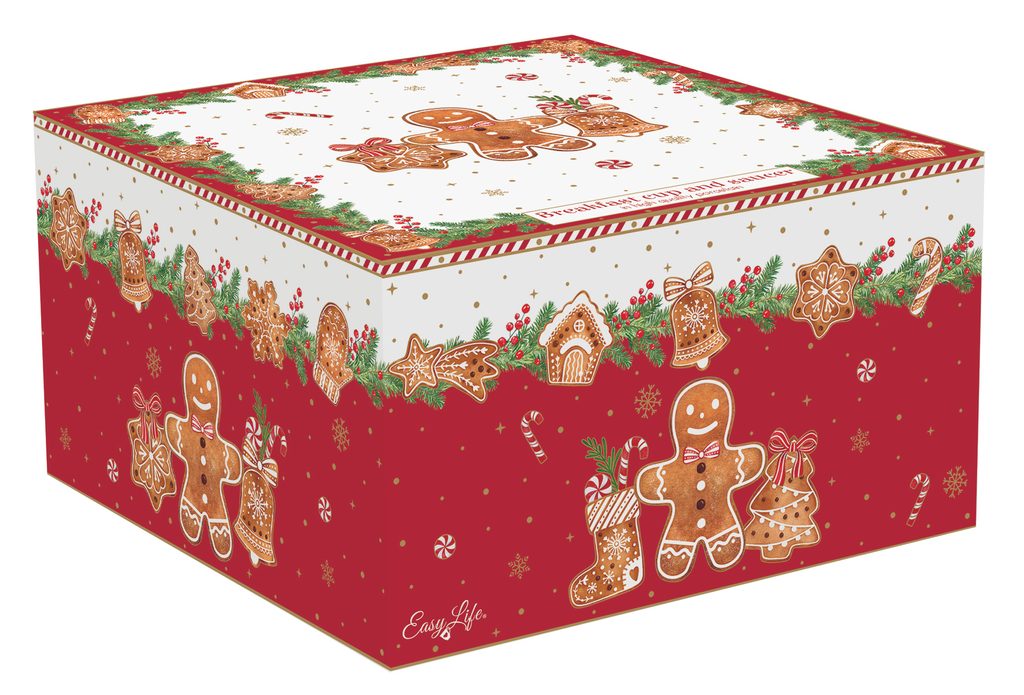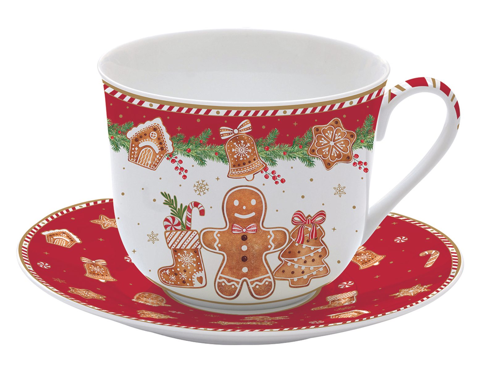 Porcelánová šálka a podšálka s motívom vianočných perníkov z kolekcie Fancy Gingerbread v elegantnej darčekovej škatuľke. Ideálne na sviatočné chvíle.