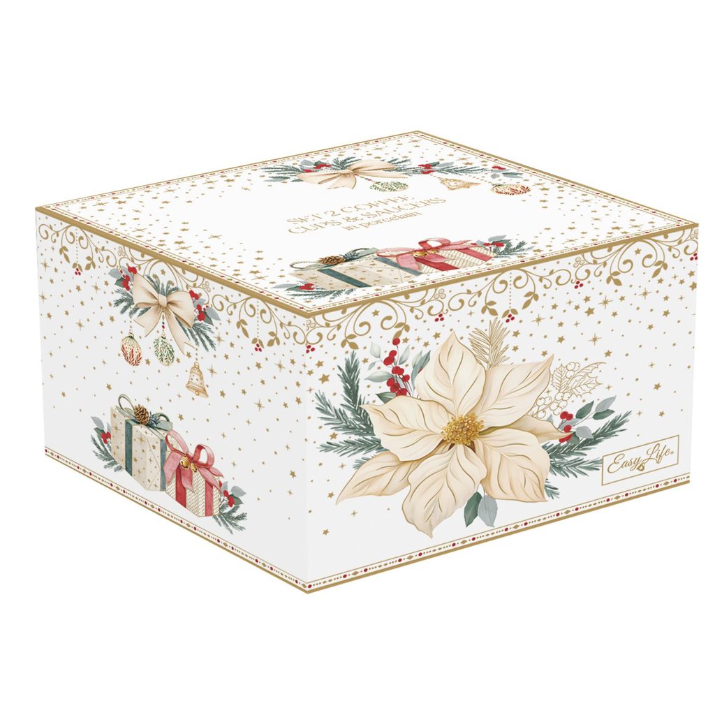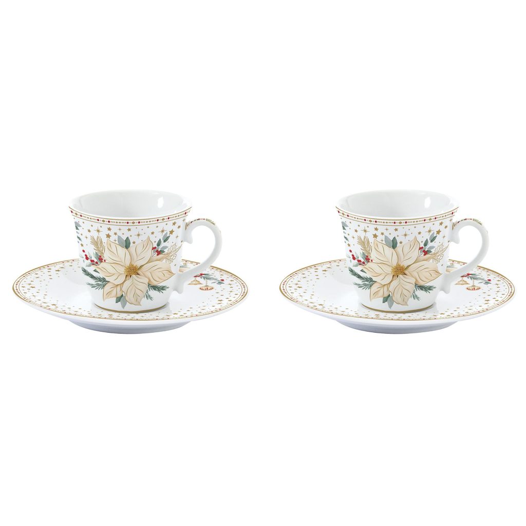 Elegantná porcelánová súprava 2 šálok a podšálok na espresso z kolekcie White Elegance od spoločnosti Easy Life. Objem 80 ml, jemný vianočný motív bielej poinsettie so zlatými detailmi a chumáčmi. Dodávané v luxusnej darčekovej škatuľke - ideálne pre sviatočné chvíle a ako darček pre milovníkov espressa.