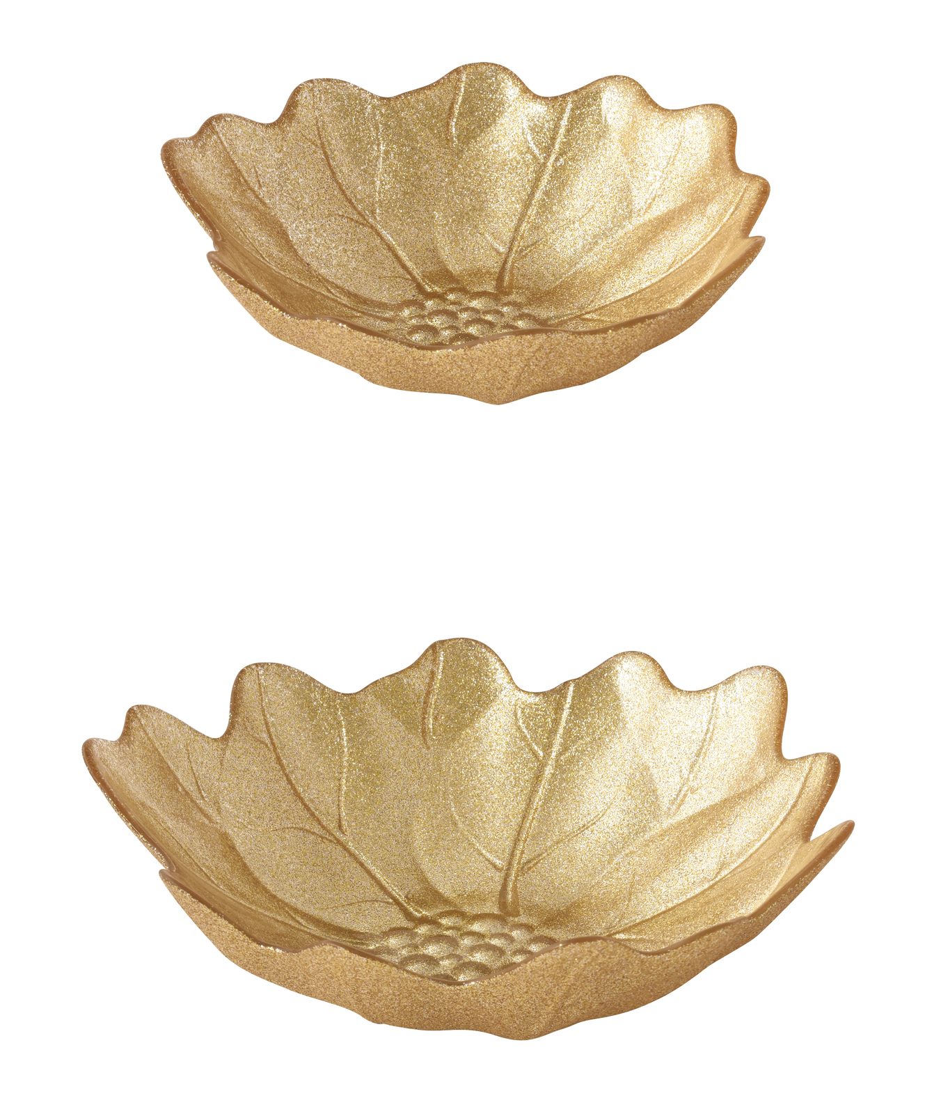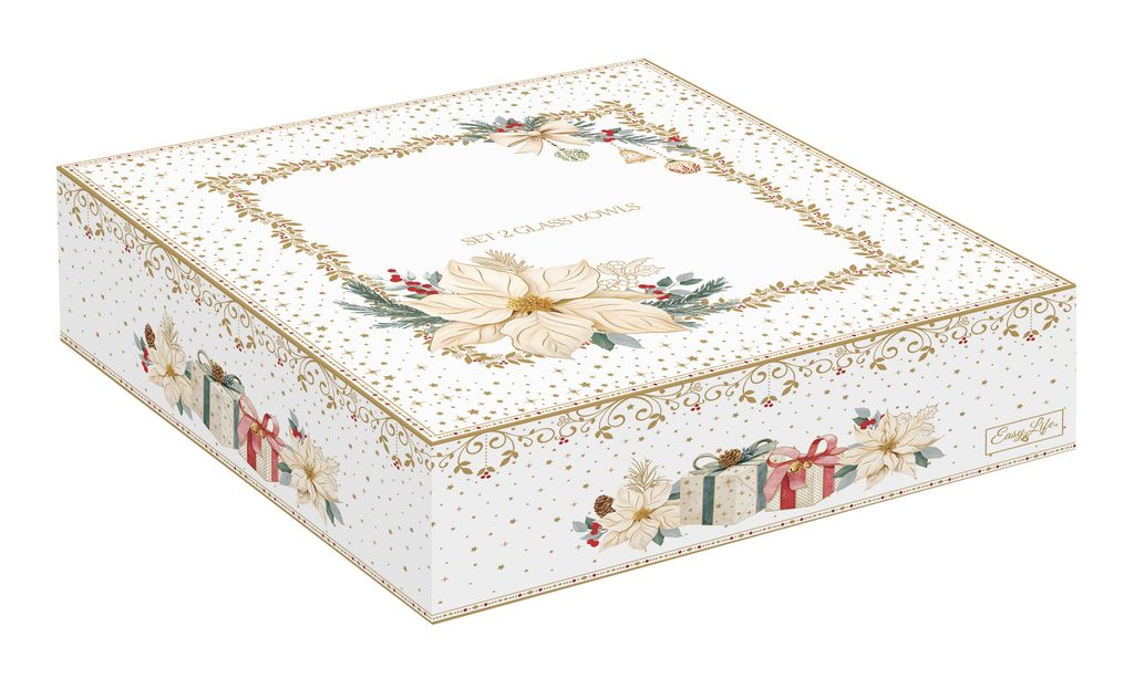 Luxusná súprava dvoch sklenených misiek v tvare poinsettie z kolekcie White Elegance od spoločnosti Easy Life. Veľkosti 16 a 21 cm, elegantný zlatý povrch, ideálne na sladkosti, orechy alebo ako dekorácia. Dodávané v darčekovej škatuľke.