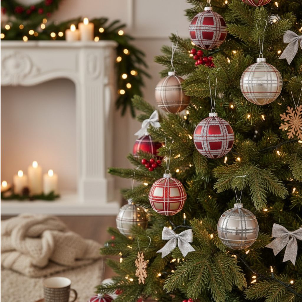 Vianočná banka prináša klasický a zároveň moderný štýl vďaka kombinácii kockovaného vzoru a elegantných farieb. Každá guľa je zdobená lesklými linkami v červených, béžových a strieborných tónoch, ktoré dodávajú ozdobám sofistikovaný vzhľad.