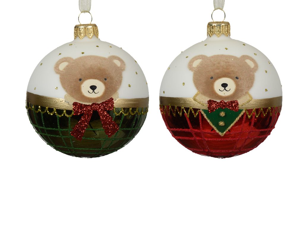 Vianočná sklenená ozdoba s medvedíkom od spoločnosti Kaemingk. Zdobená guľa s roztomilým medvedíkom, ideálna na stromček a vianočné dekorácie. Jemné trblietavé detaily, tradičné vianočné farby a kvalitný sklenený dizajn.