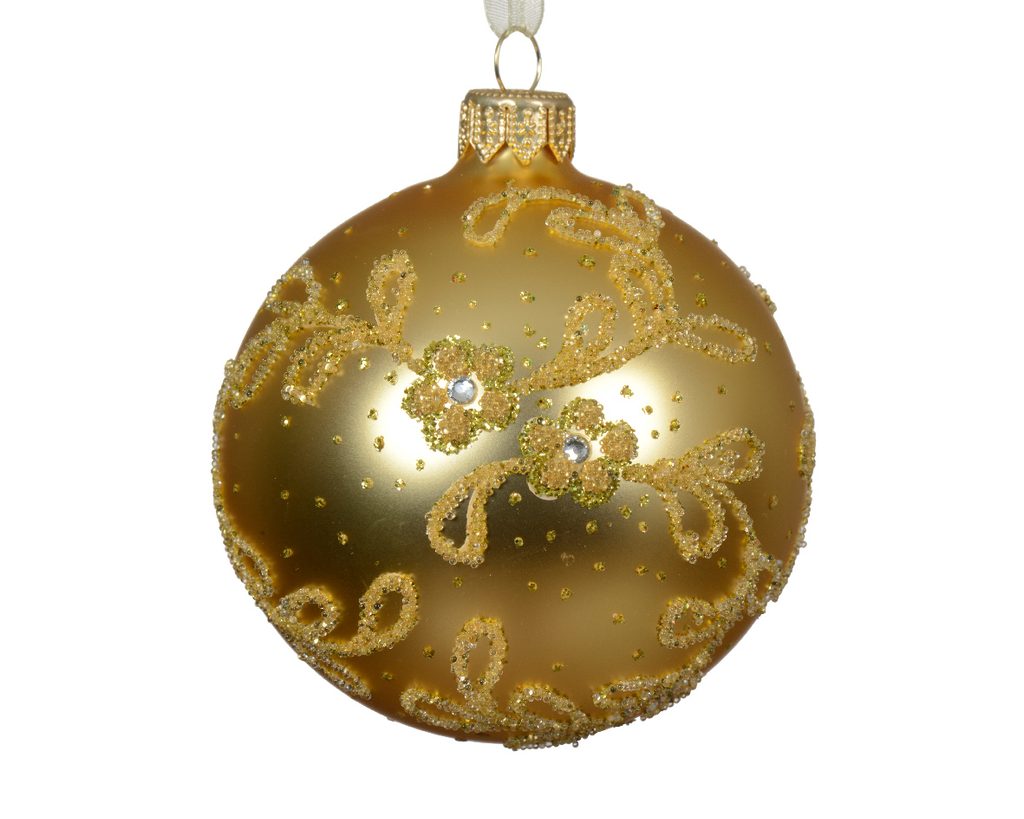 Elegantná sklenená vianočná ozdoba od renomovanej holandskej značky Kaemingk. Zlatá guľa zdobená zlatými detailmi dodá vašej vianočnej výzdobe nádych luxusu. Ideálny doplnok na váš vianočný stromček alebo sviatočnú výzdobu.