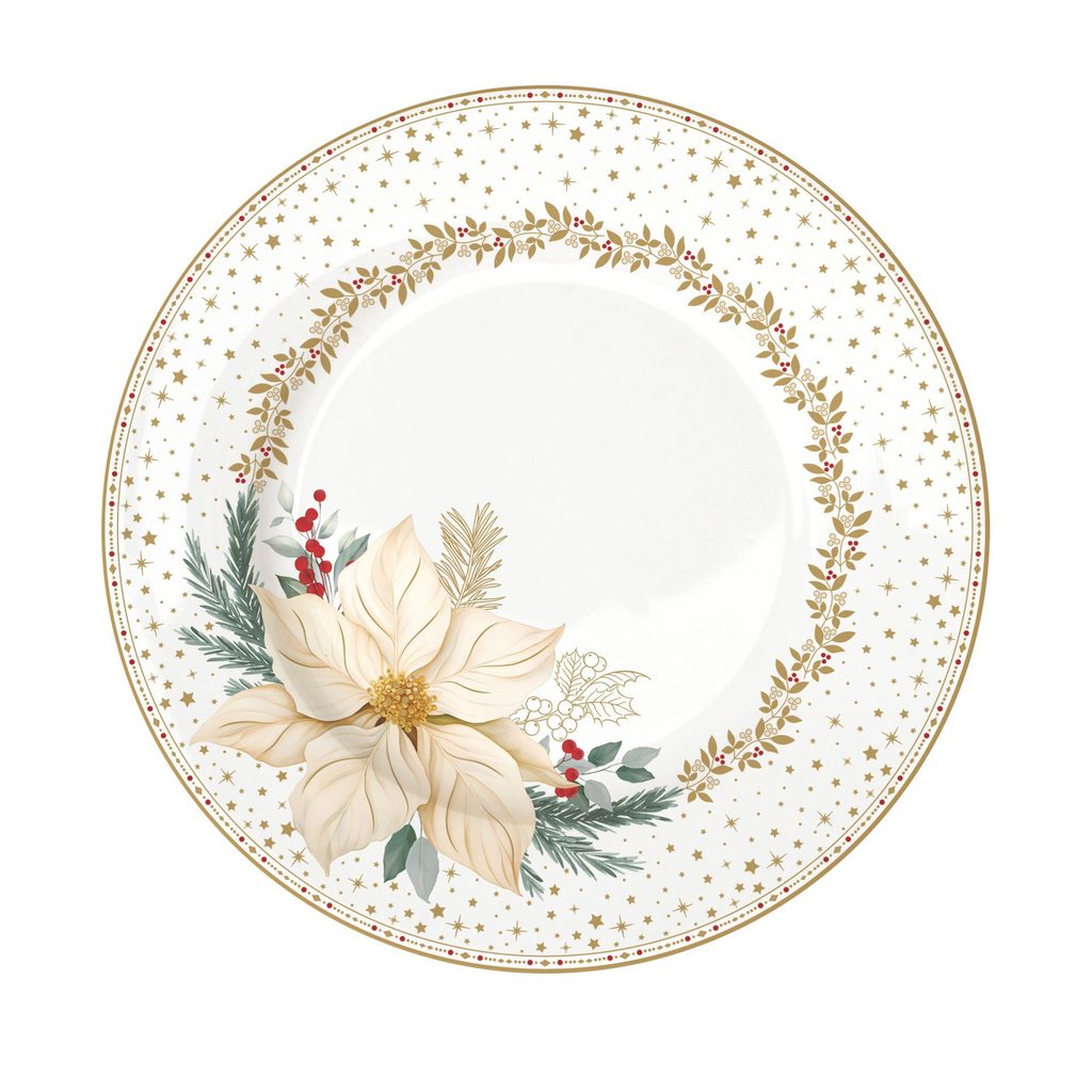 Porcelánový vianočný dezertný tanier z kolekcie White Elegance od spoločnosti Easy Life s priemerom 19 cm dodá vášmu sviatočnému stolovaniu jemnú eleganciu. Zlaté hviezdičky, girlanda z listov a motív bielej poinsettie s chumáčmi a bobuľami vyčarujú hrejivú a čarovnú atmosféru na servírovanie sladkostí, dezertov a malých predjedál.