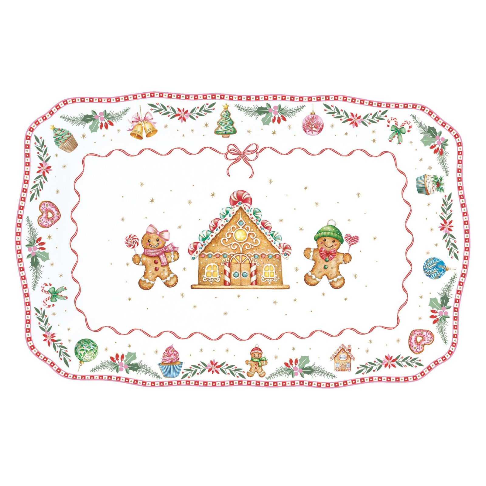 Vianočný porcelánový podnos z kolekcie Sweet Christmas s motívom perníkov a chalúpky. Ideálny na sladkosti alebo vianočné pochúťky, dodávaný v darčekovej škatuľke.