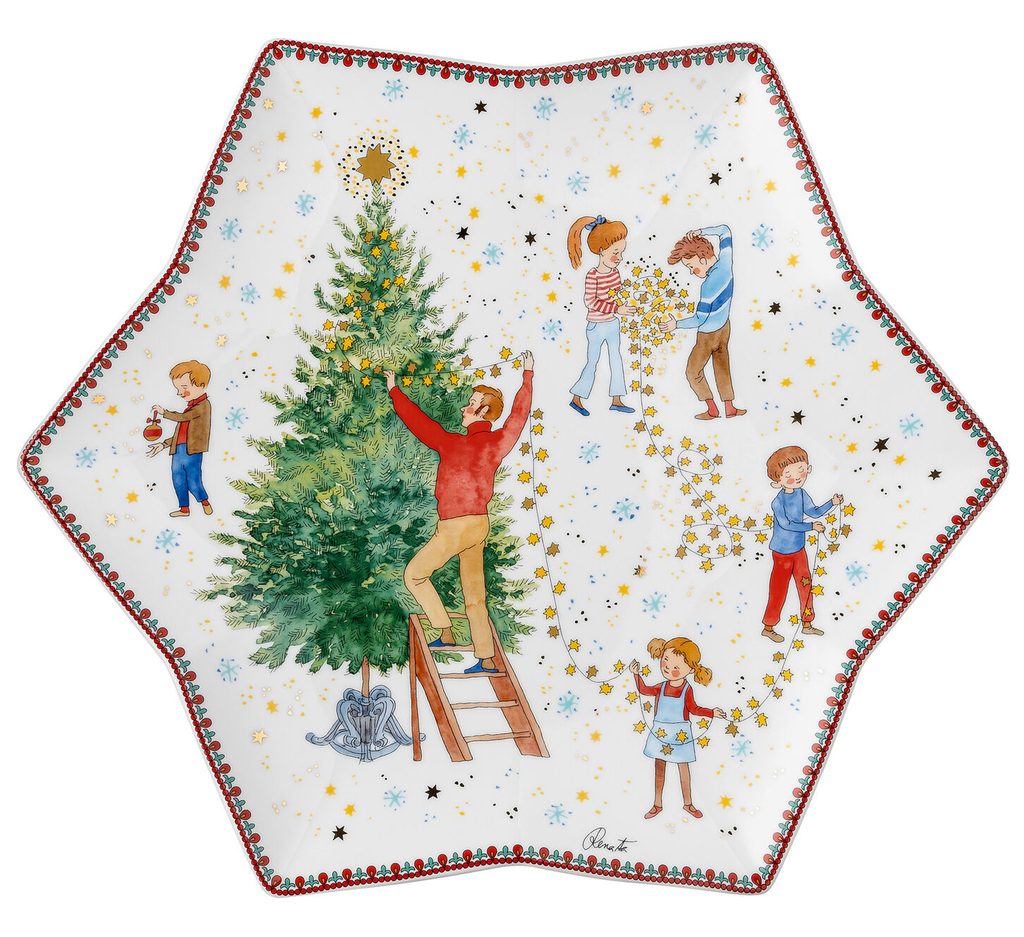 Vianočný porcelánový tanier v tvare hviezdy s priemerom 34 cm na servírovanie cukroviniek. Tanier je súčasťou výročnej zberateľskej kolekcie Christmas Lights 2024 – Weihnachtsleuchten, ilustrovaný českou výtvarníčkou Renátou Fučíkovou pre porcelánku Hutschenreuther firmy Rosenthal. Táto už 7. kolekcia skvele doplní vašu predchádzajúcu zbierku.