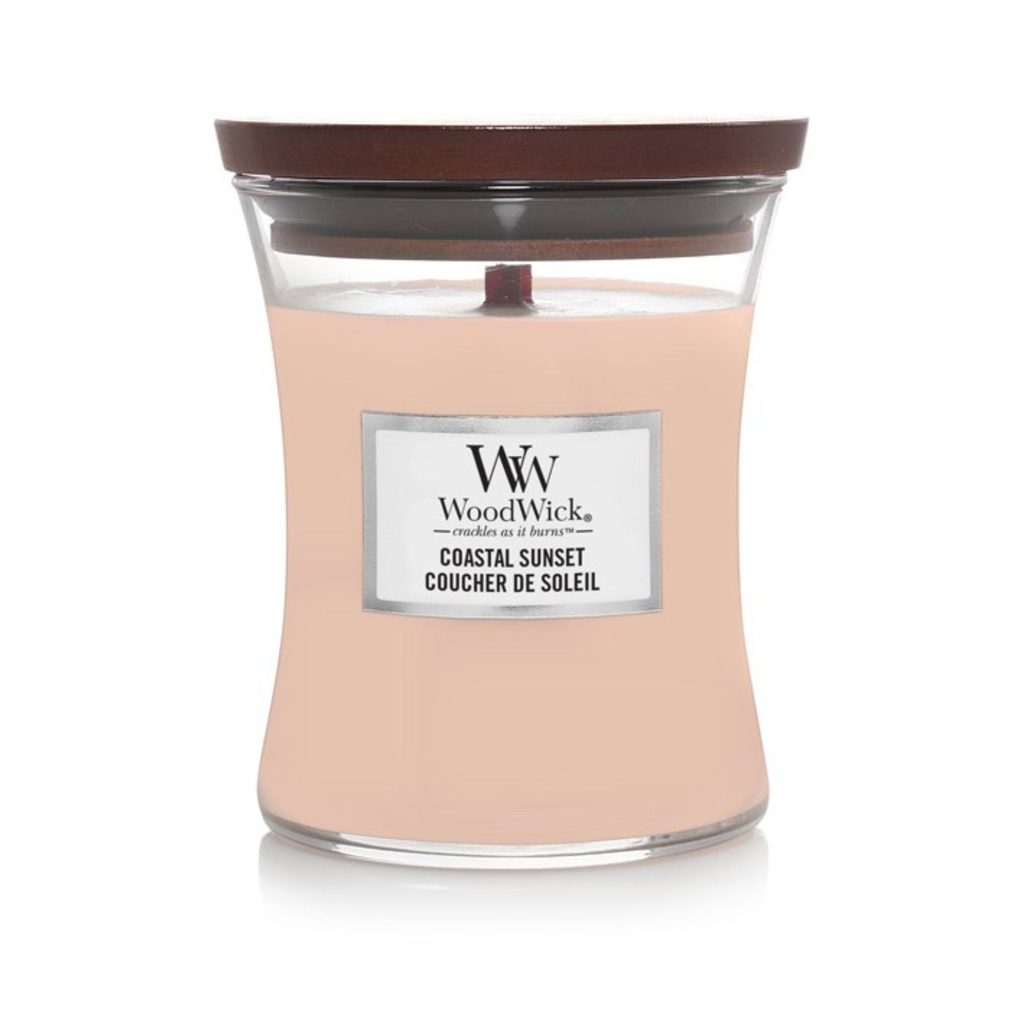 Vonná sviečka v tvare strednej vázy s dreveným knôtom WoodWick s vôňou západu slnka na pobreží. Kvety, pohladené slnkom, prívetivá vôňa kokosu a slaného oceánskeho vetra dokonale zachytáva hrejivú atmosféru morského pobrežia.