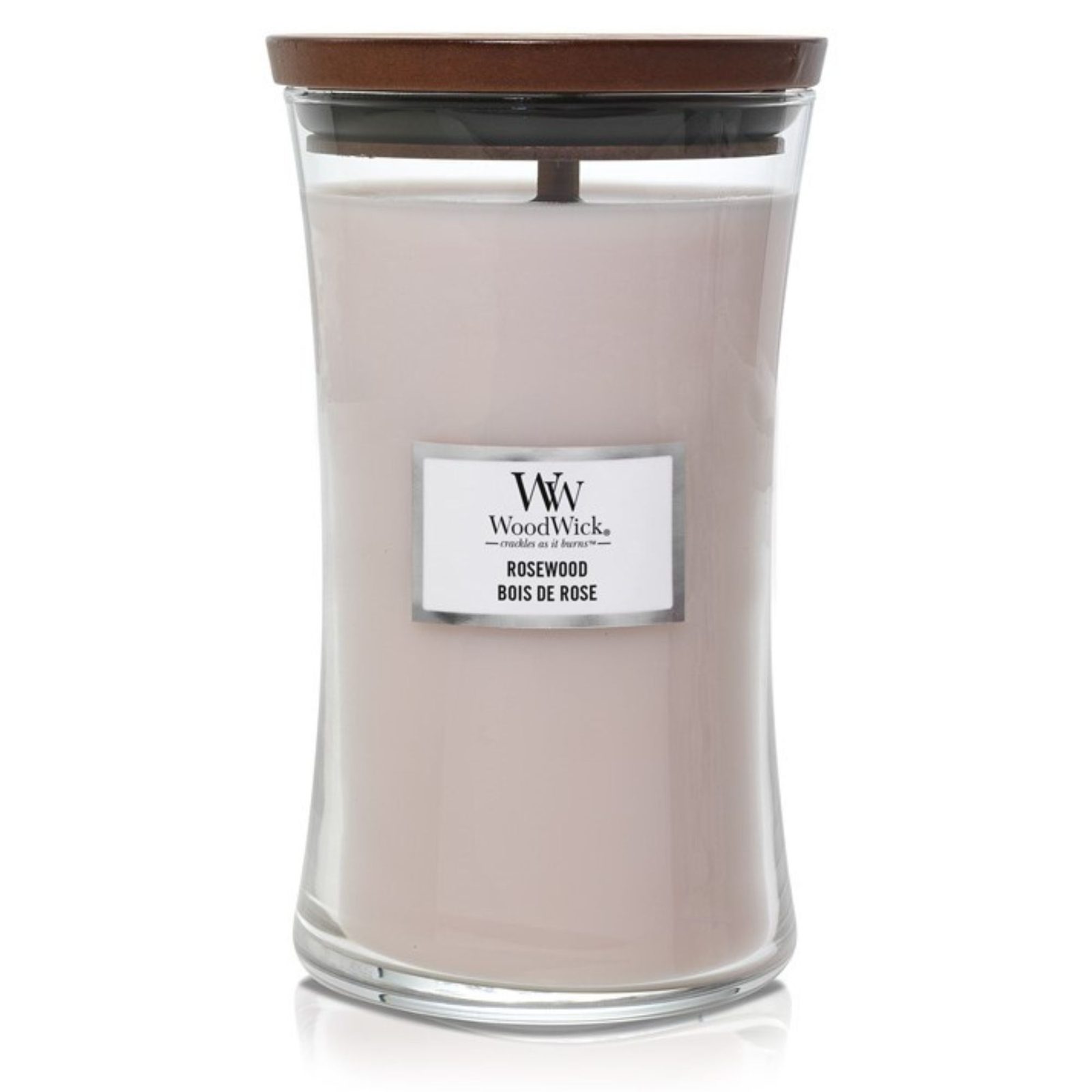 Vonná sviečka v tvare veľkej vázy s dreveným knotkom WoodWick s vôňou palisandra. Roseberry a jemný čajový akord sa spájajú s vôňou cédrového dreva a pižmovými tónmi.
