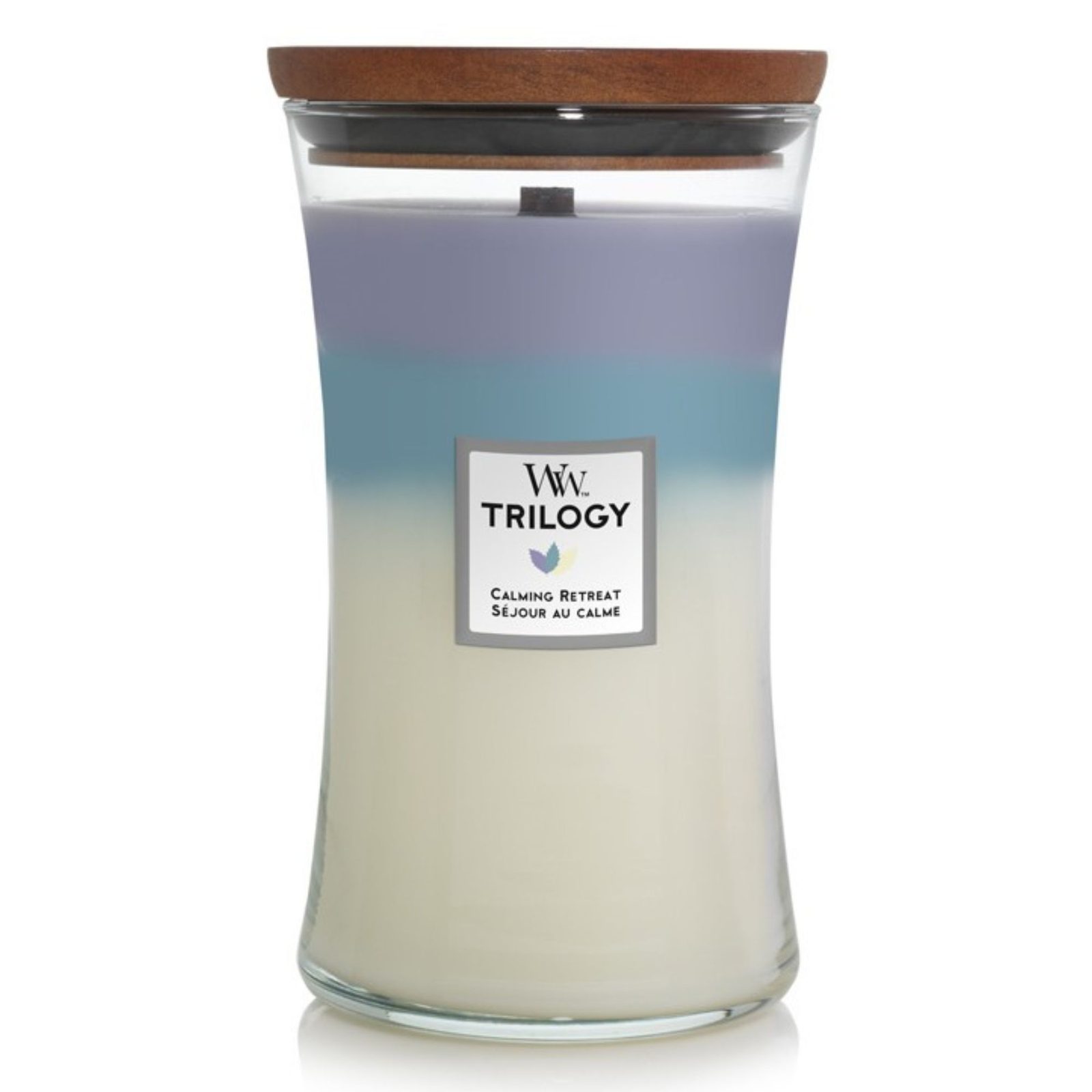 Vonná sviečka WoodWick v tvare veľkej vázy s dreveným knôtom s vôňou pokojného útočiska. Sviečka Trilogy s tromi rôznymi vôňami, ako je levanduľová kúpeľová, morská soľ s bavlnou a biely čaj s jazmínom, navodzuje pocit pokoja a harmónie.
